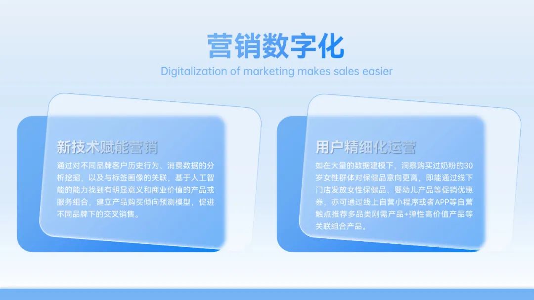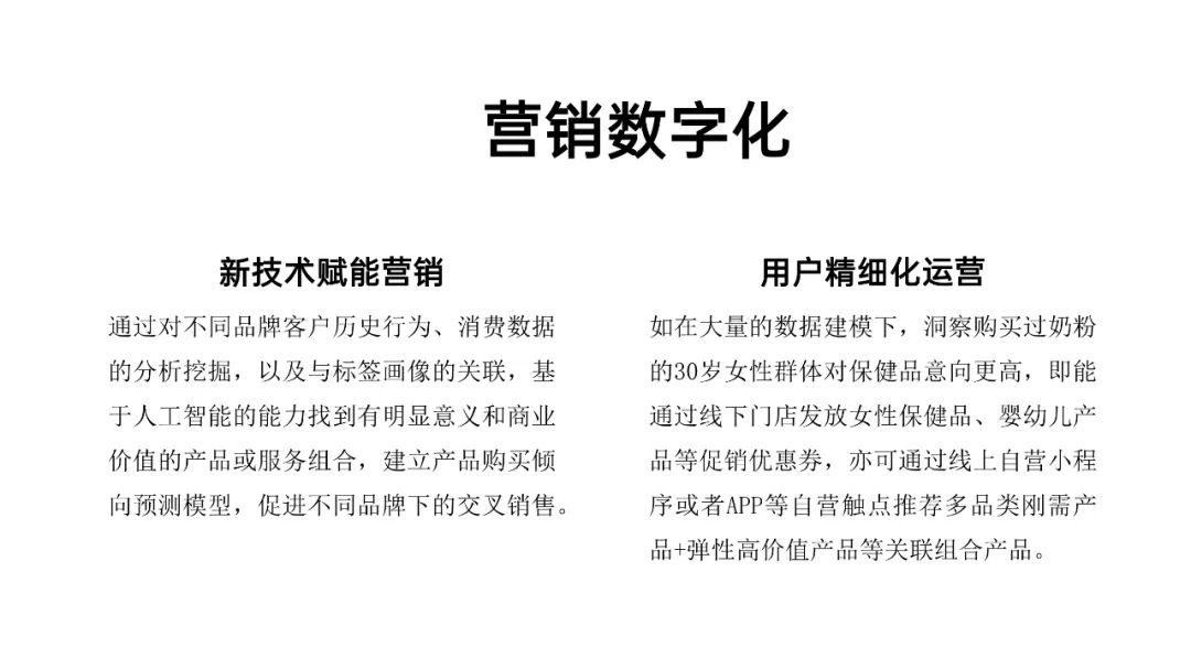 如在大量的数据建模下,洞察购买过奶粉的30岁女性群体对保健品意向更高,即能通过线下门店发放女性保健品、婴幼儿产品等促销优惠券,亦可通过线上自营小程序或者APP等自营触点推荐多品类刚需产品+弹性高价值产品等关联组合产品。