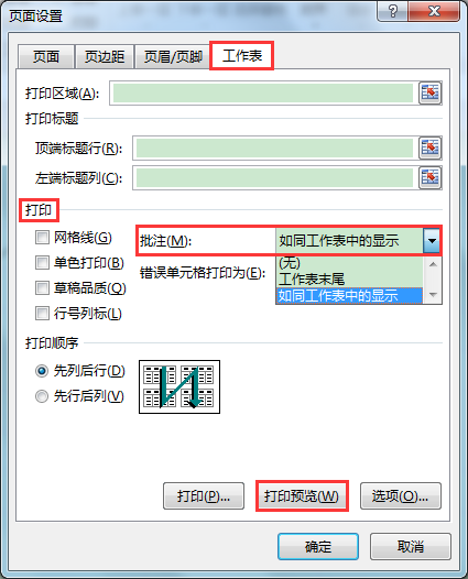 2、在打开的"页面设置"对话框中,切换到"工作表"选项卡,在"打印"下的"批注"编辑框下拉列表中选择"如同工作表中的显示"。接着单击"打印预览"按钮,可见批注编辑框内容和工作表中的单元格内容一同显示出来了。