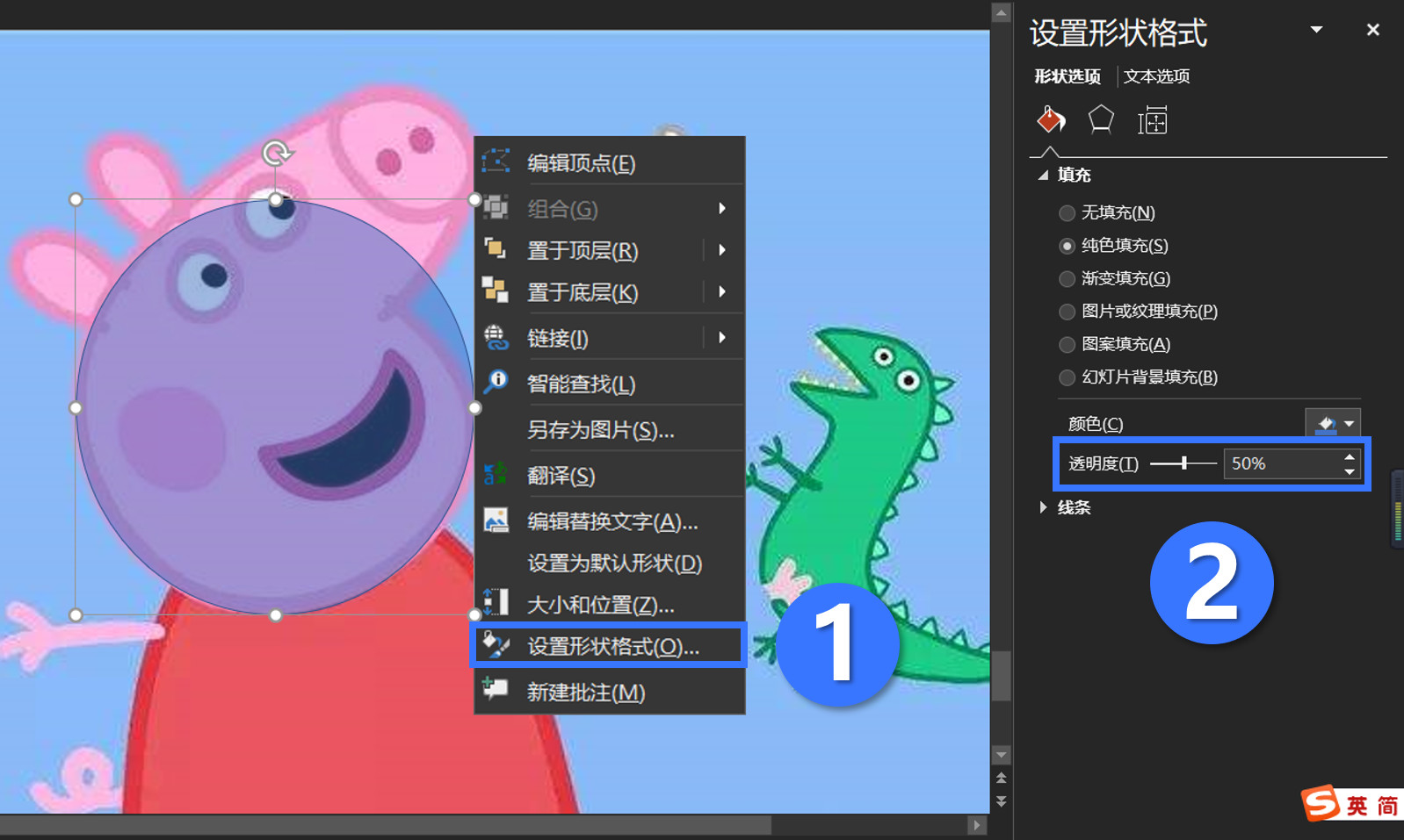 2)插入一个圆形盖在他脸上,右击形状-【设置形状格式】-调整一下透明度,这样你才能看到形状下方的图片: