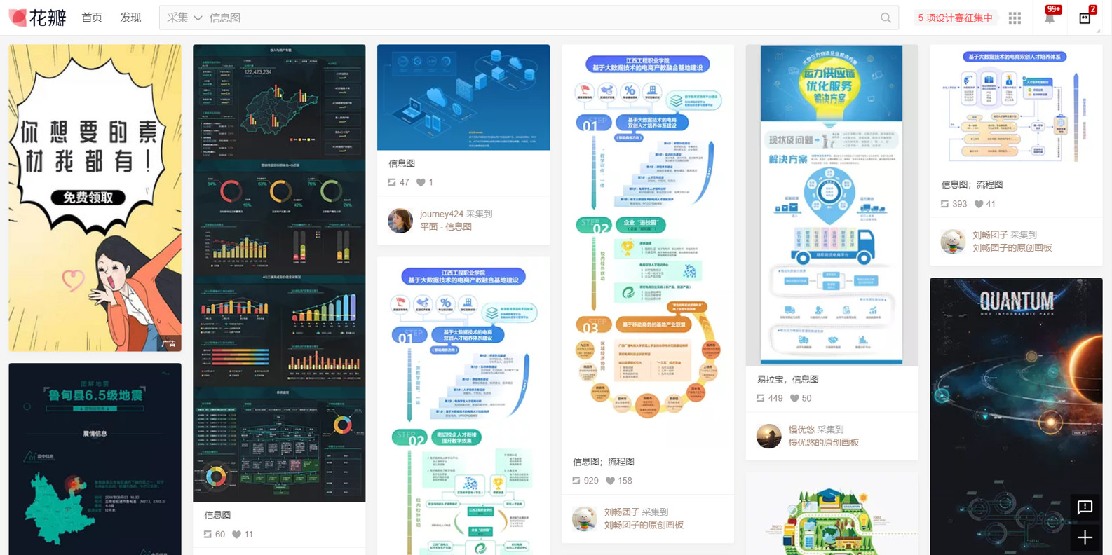 去花瓣网上搜索“信息图”或“PPT图表”,你就能找到一大堆大神们设计的图表:
