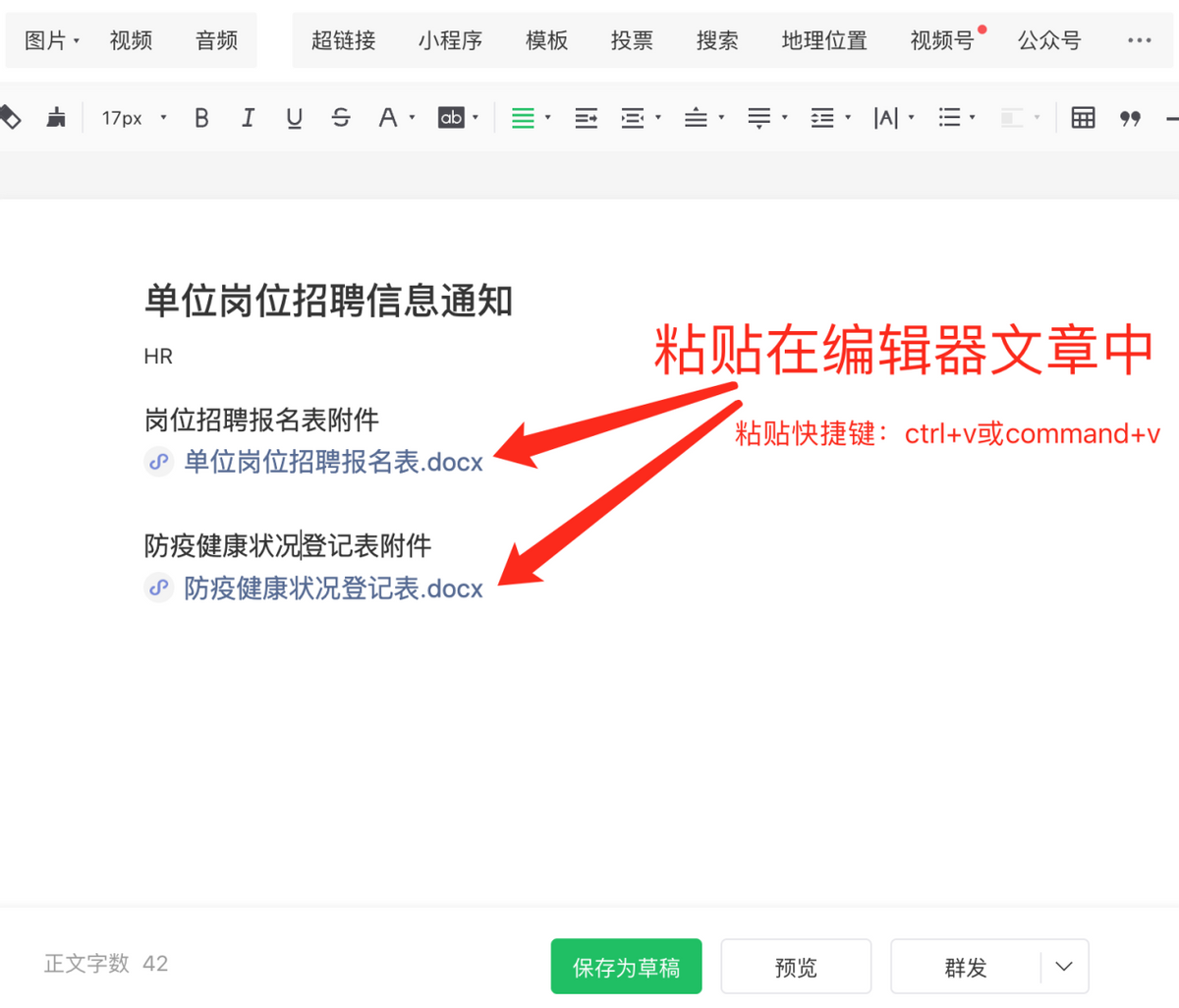 在上面图中,我分别复制了《单位岗位招聘报名表.docx》和《防疫健康状况登记表.docx》,然后分别粘贴在文章中的两个位置,所以在文章中插入了“单位岗位招聘报名表.docx”和“防疫健康状况登记表.docx”两个附件。