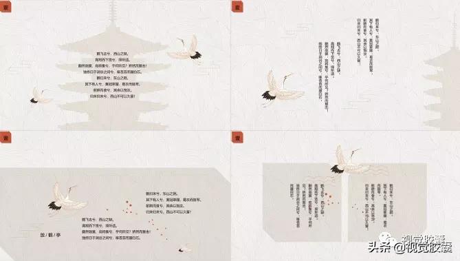 仙鹤、云雾、山水等元素的国风,更是可以突出仙风道骨之感。色调也不用古朴,以明度灰度高的配色为主即可。排版上也可以以卷轴、圆形展开,更有一抹韵味。
