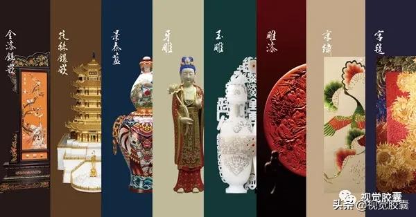 其中的中国宫廷元素及配色也是华美感的重要来源。国画、文物、宫廷纹饰这些华美质感中的元素配色都偏稳重,所以不太适宜留白过多与较为活泼的方案。