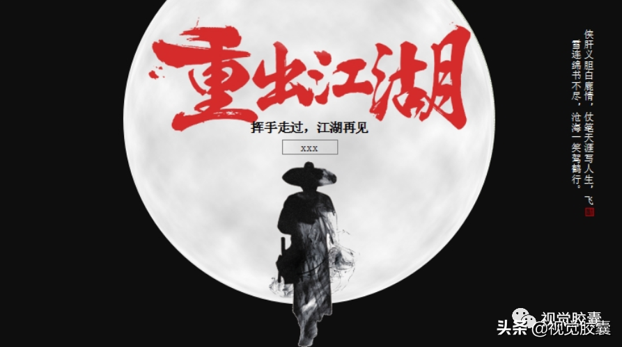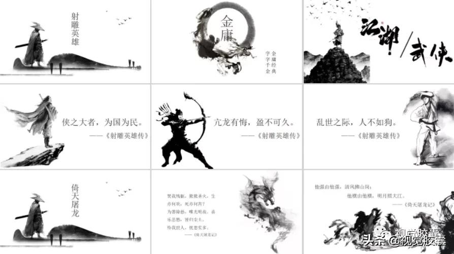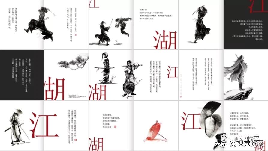 水墨元素也可以变化为武侠风格,则突出文字效果。书法、墨迹可以直接刺激观众的视觉。排版上即使大量留白,力量感冲击力依旧很大。
