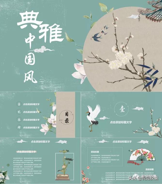 不止有中国红,古典、清雅的风格一样有配合的PPT。其实工笔画中水墨、浅绛、青绿、金碧、界画等艺术元素均可在汇报中展现。