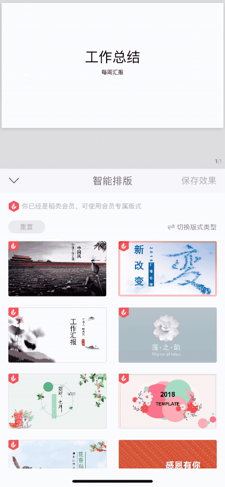 人工智能可以帮用户的第一件事是美化,主要是在 PPT 上。WPS 的稻壳儿中有几十万个模板,AI 先去学习这些模板的设计,然后就拥有自动推荐模板的能力。未来,可以在恰当时机为用户推荐一些模板,辅助用户内容创作。