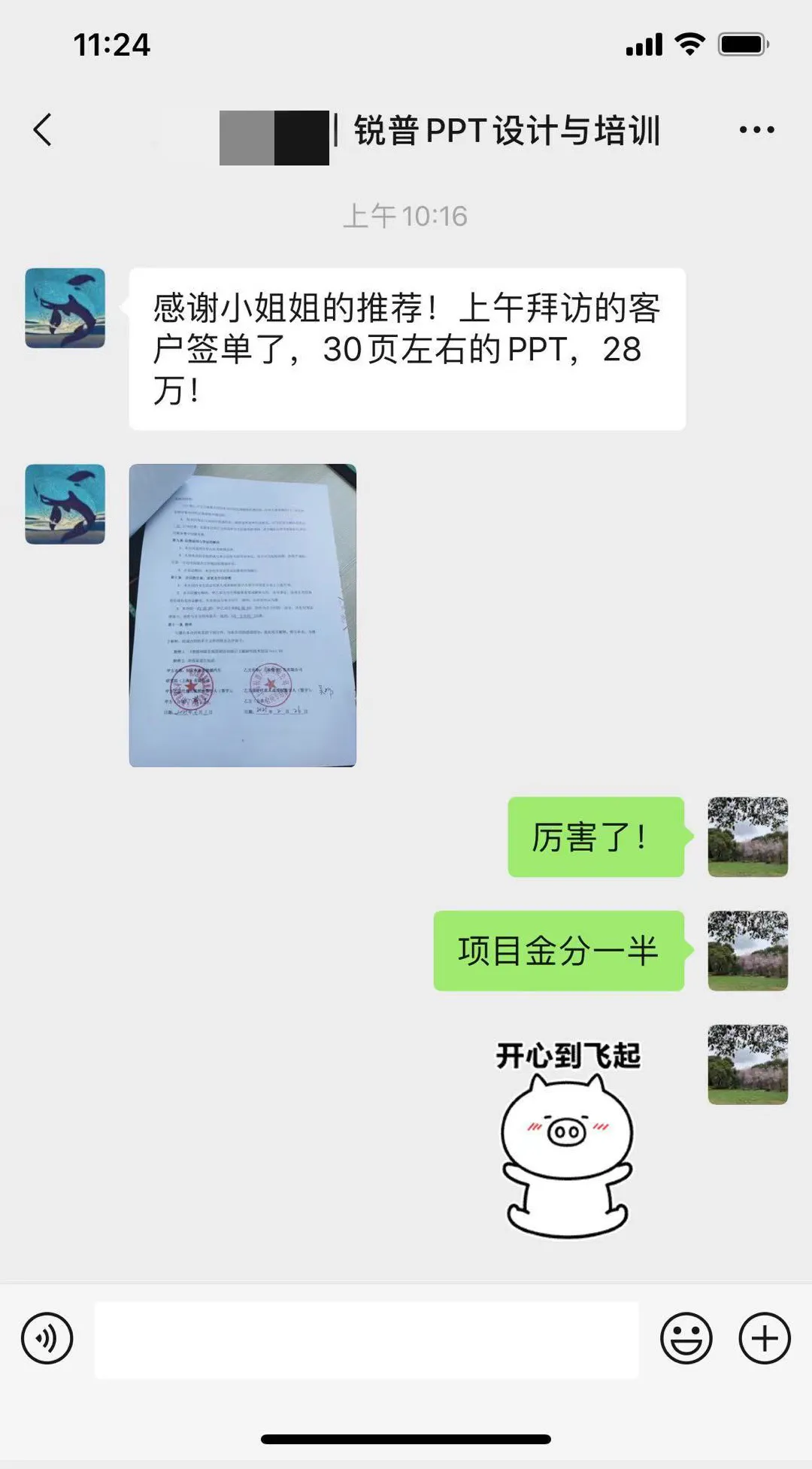 客户部小哥哥发来消息,他又签了一个28万的订单,平均一页PPT一万块。据说,从去年年中以来他已经接了很多这样的大单。