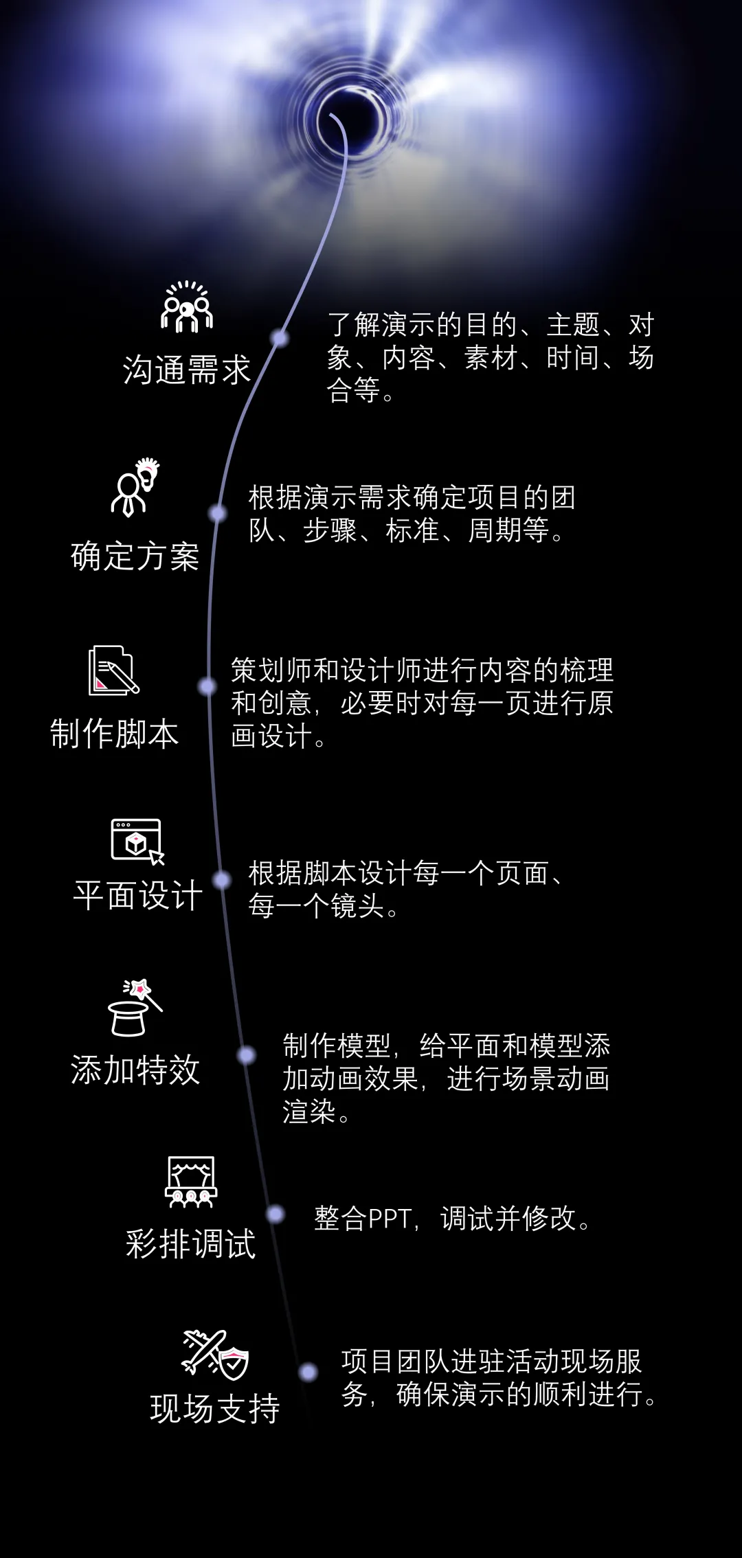 演示舞台,瞬息万变,各种突发情况都是难以避免的。我们服务的很多客户,甚至在上场前几分钟还在微调PPT。但如果是视频,根本不敢想象。一个5分钟的特效视频,光渲染可能都要十几个小时,更别说临时修改了。