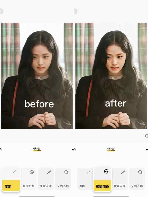 但略遗憾的是,这项功能似乎对人物图会有实效,像模糊照片、老照片、失焦废片等,带有人脸轮廓的图片,修复效果很显著,但对于物品、宠物等图片,修复效果一般。