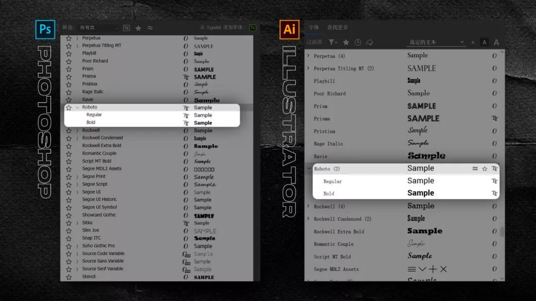 在 Ps 、AI 这两款软件中,也能找到这款字体的两个字重: