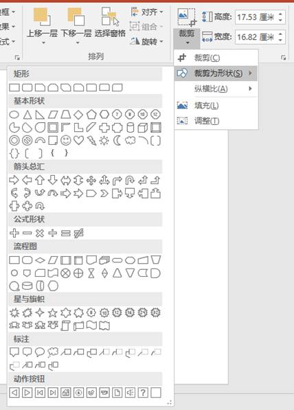 点击小三角形,会有下拉菜单,第二个选项为「裁剪为形状」,点开后会出现很多不同的形状。