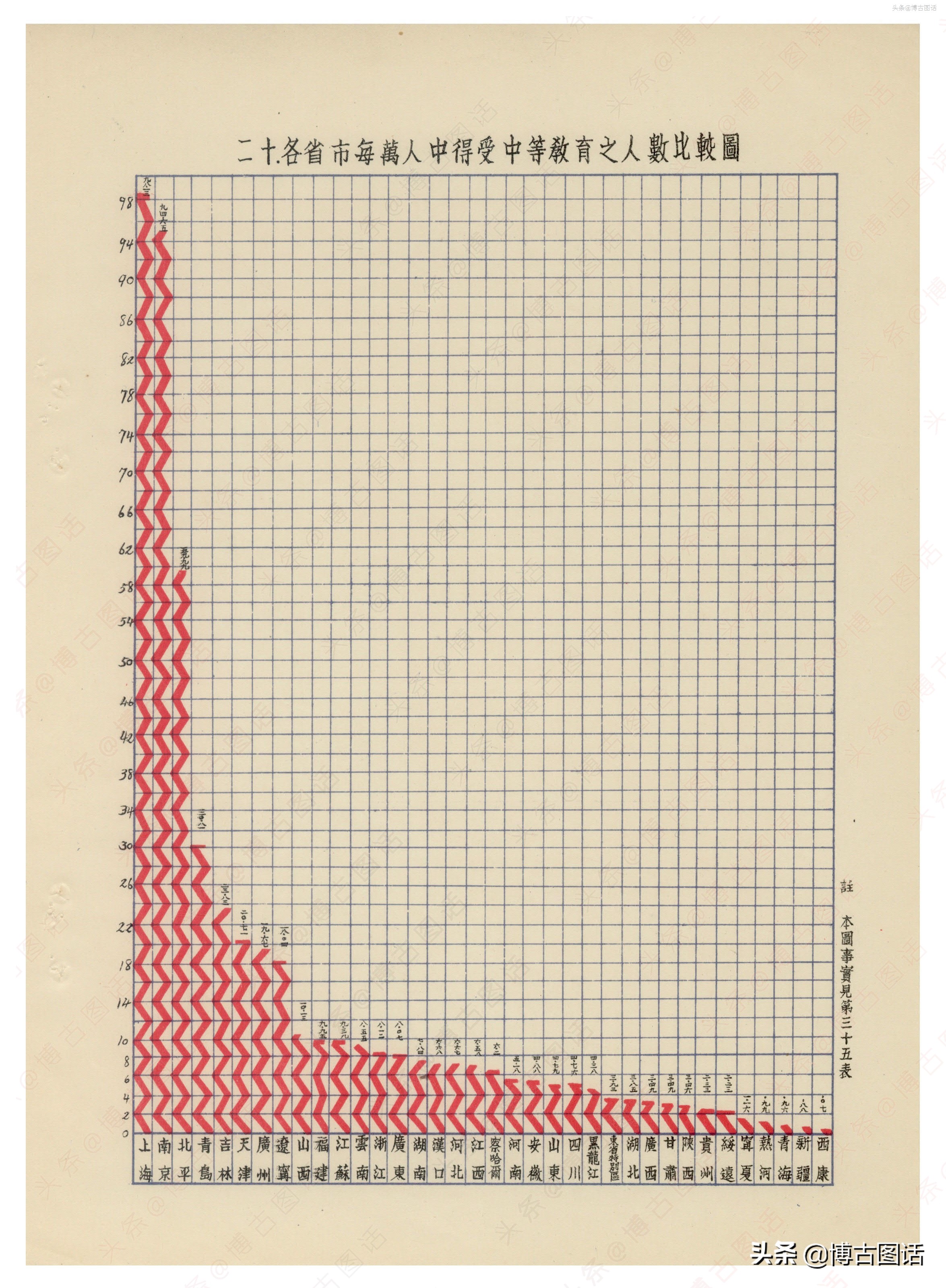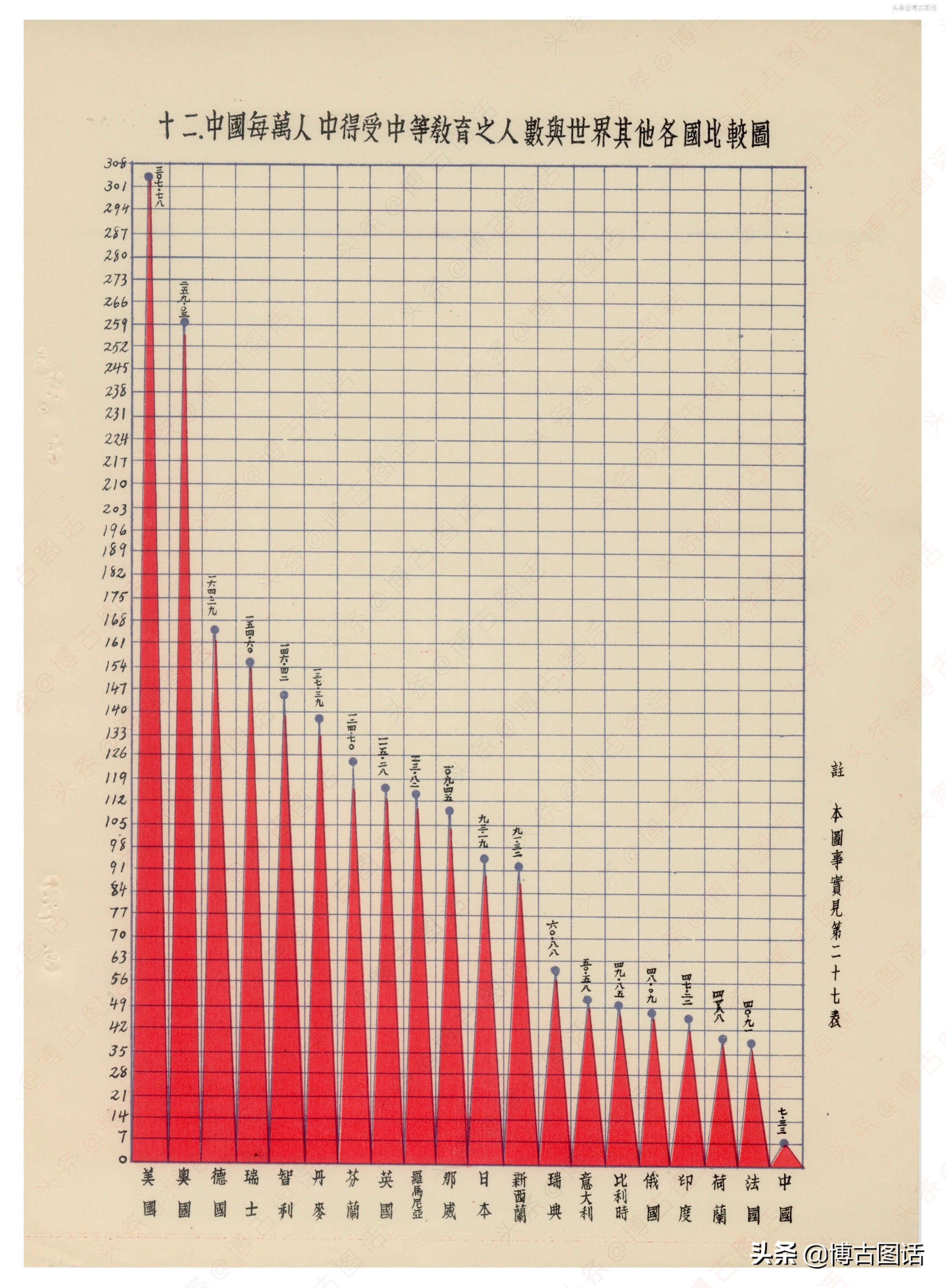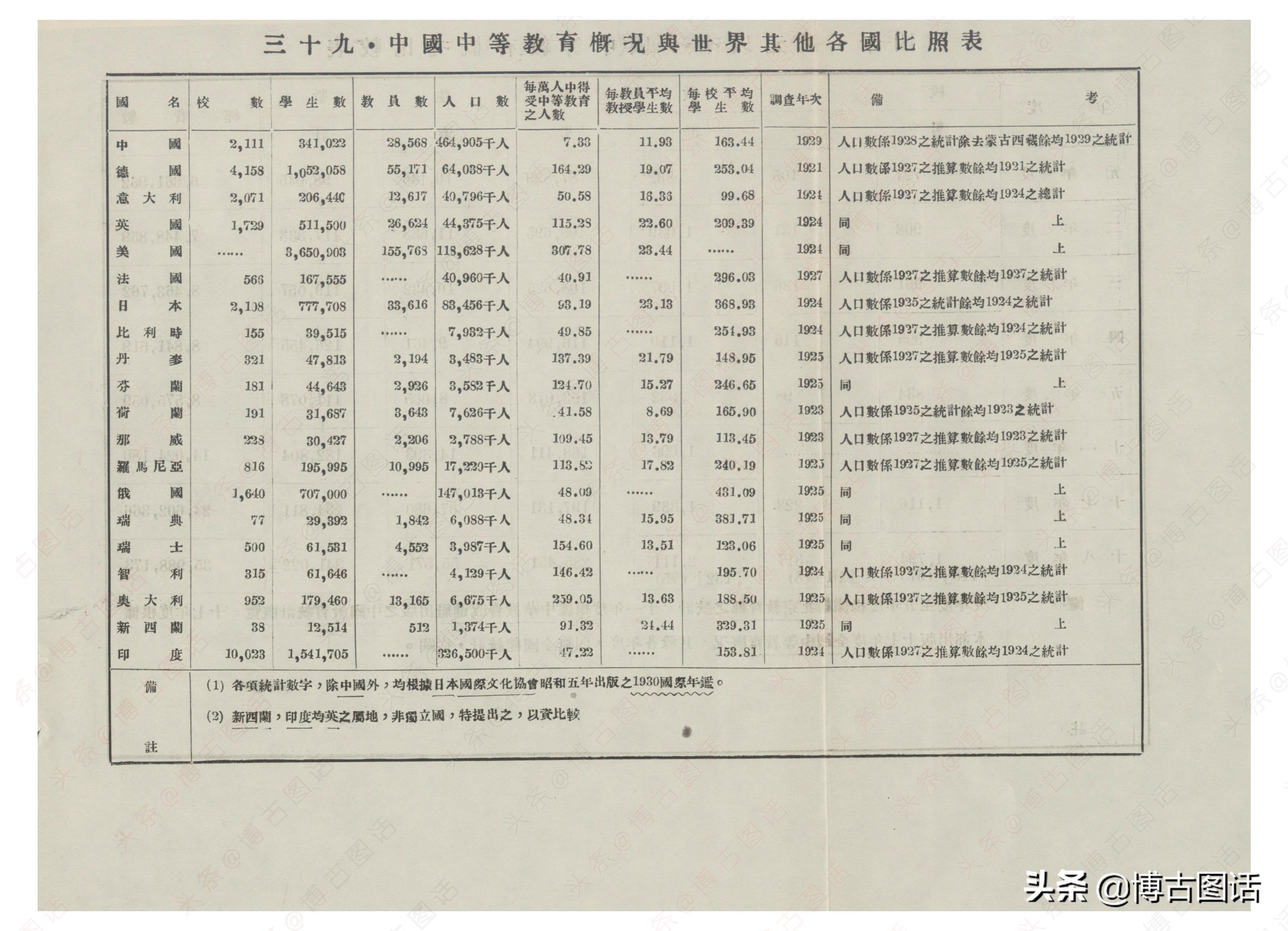 根据1929年调查数据,中国的人口应该应该是全球最多的,接近5亿。根据各国人口数计算每万人口中专科以上学生数,美国居第一位(73人),加拿大居第二位(57人),德国居第六位(24人),英国居第十四位(12人),日本居第十七位(6人),我国居第十九位(1人)印度居第二十位(0.3)。