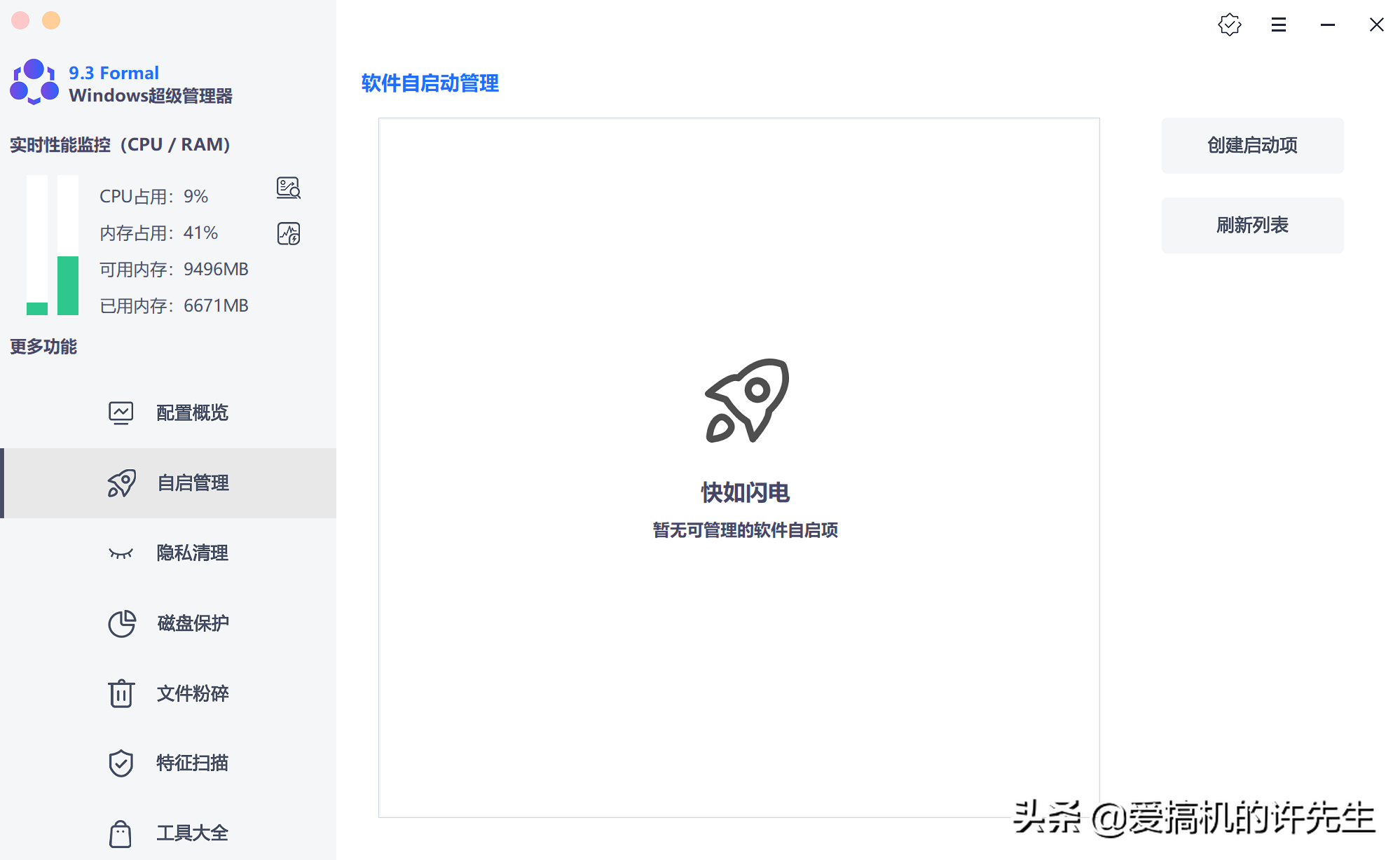 电脑开机运行慢,硬件没问题的话,那就是软件自启项太多了,那你可以在这里看到所有的自启项,不想自启的可以统统给它关闭。(因为许先生的电脑,被我整的实在太干净了,所以这里没有自启项[机智])