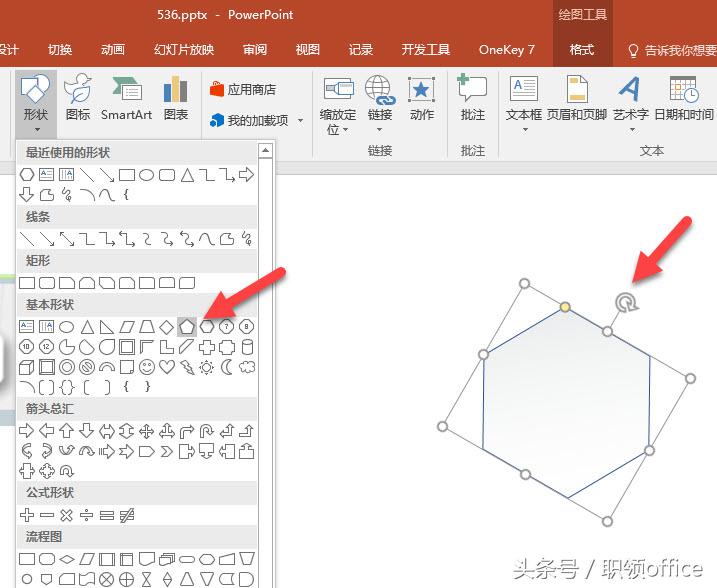 插入一个五边形,将其旋转至下图的角度,就是黄点在顶端,注意看下图箭头处。