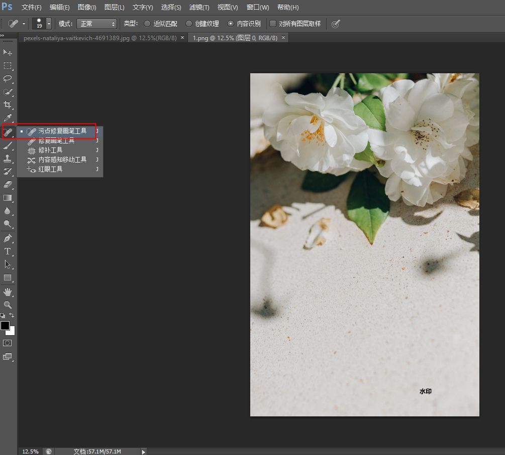 第一步:首先我们用PS打开需要去吹水印的图片,然后在左侧工具栏中找到并点击【修复画笔工具】。