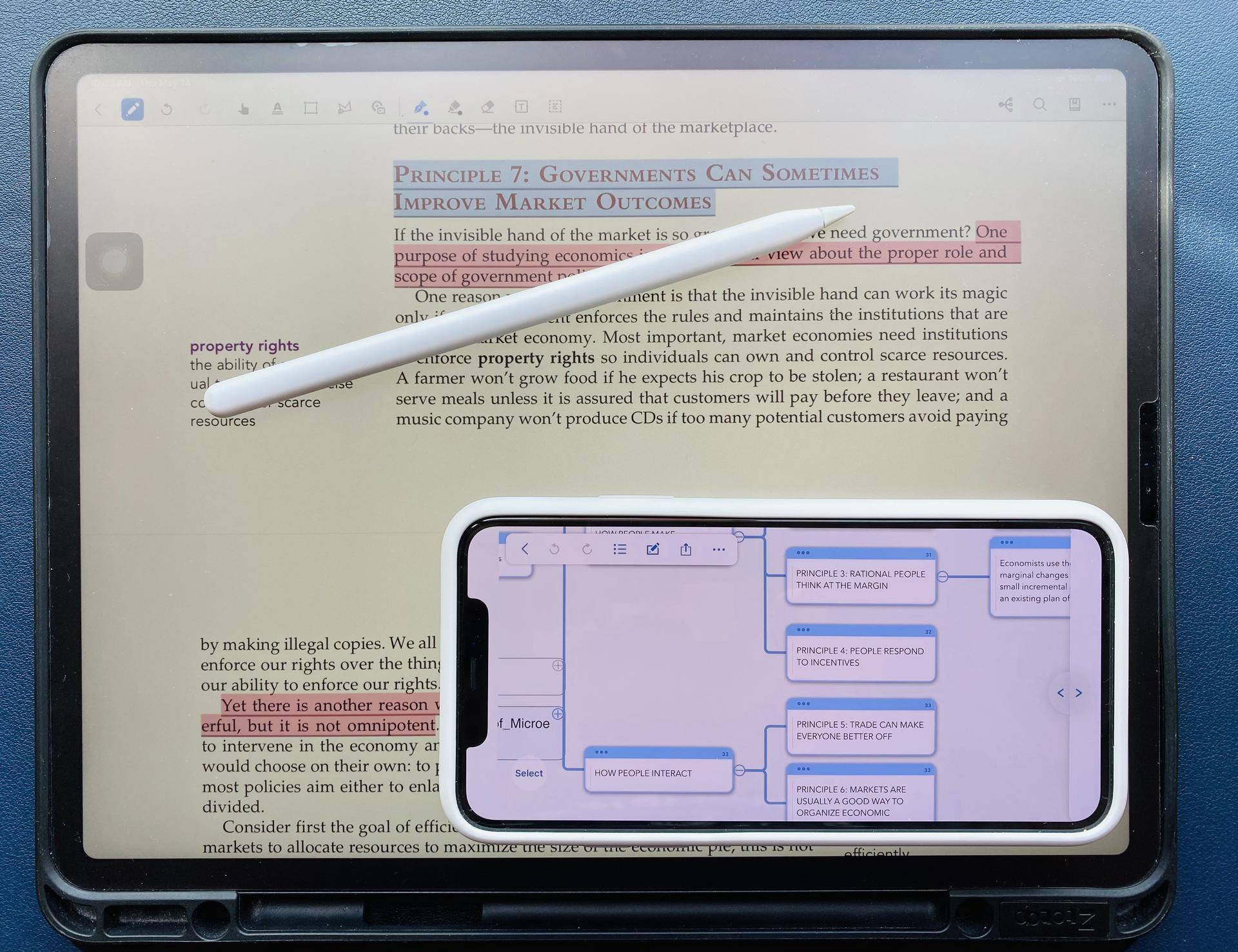 ▲MarginNote 3 的 iPad 与 iPhone 端展示,其中 iPad 展示的是打开的电子课本,iPhone 11 Pro Max 展示的是脑图。
