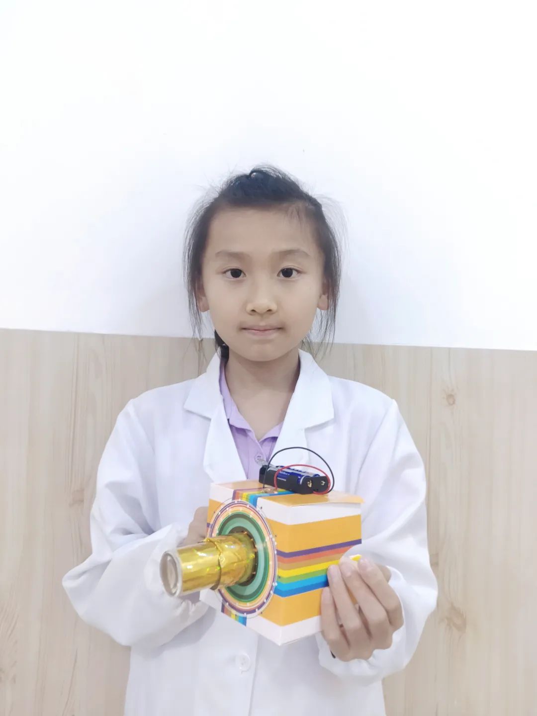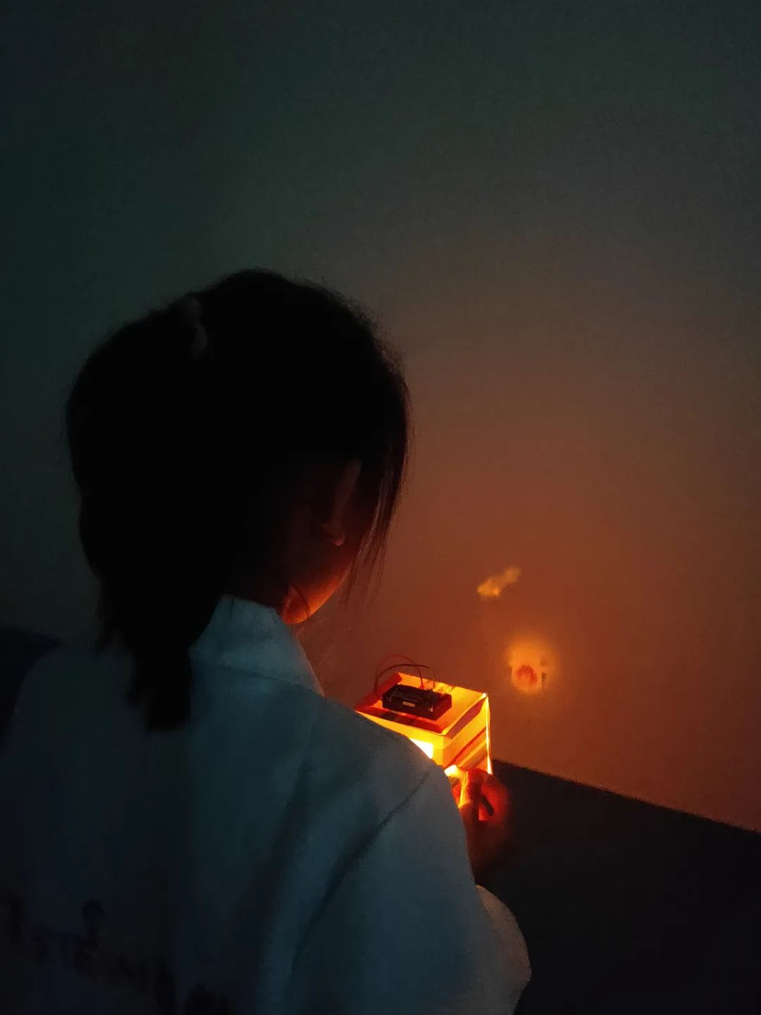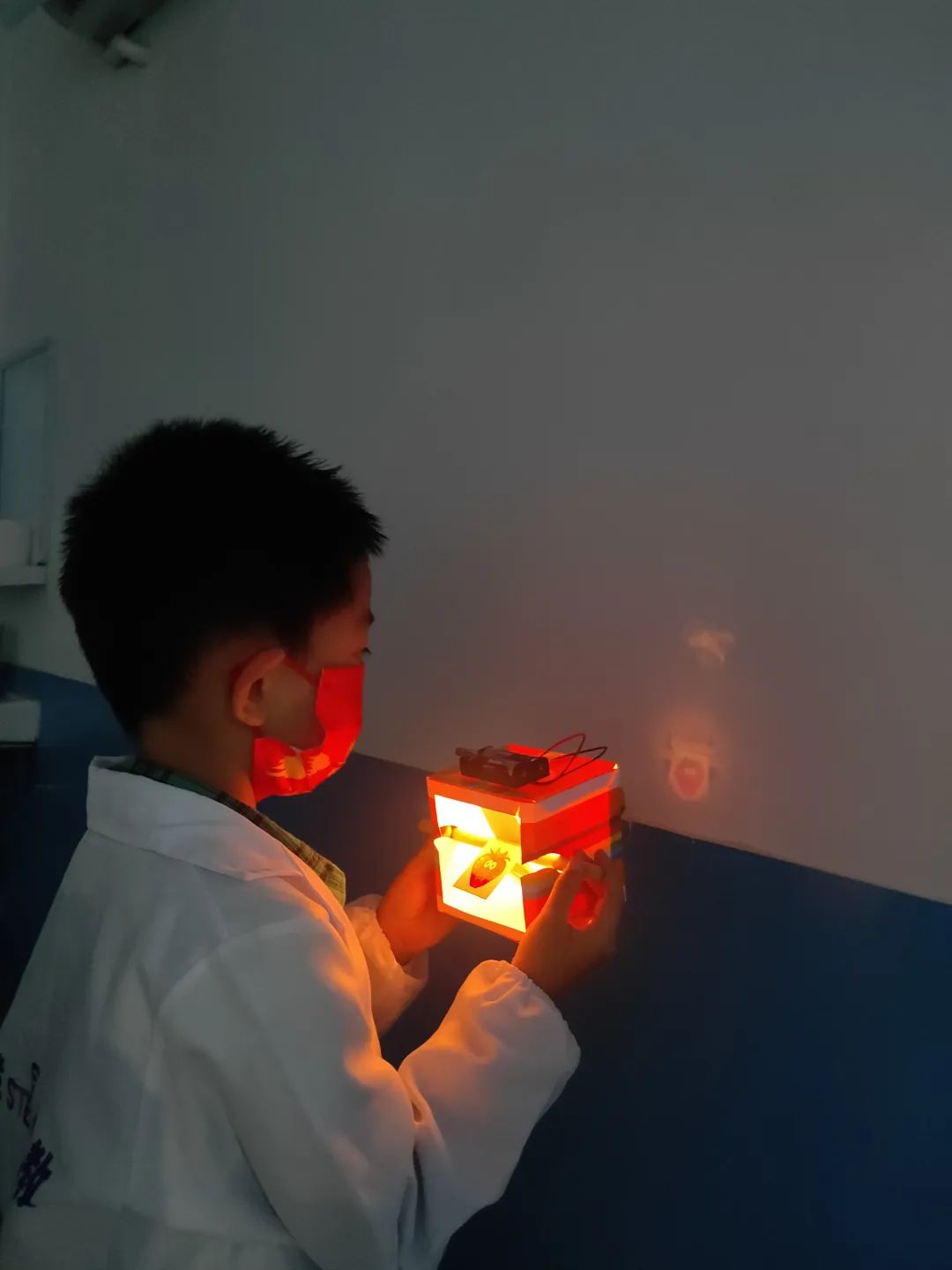 我们制作的“投影仪”是在比较暗的外部环境中,使印有连续图案的图片在内部小灯泡的光照下形成影子,通过转动图片转轴制造出会动的影子效果,再利用凸透镜的作用将影子放大并投射到幕布上。这样我们就边转动转轴边能欣赏到连续的动画效果了。