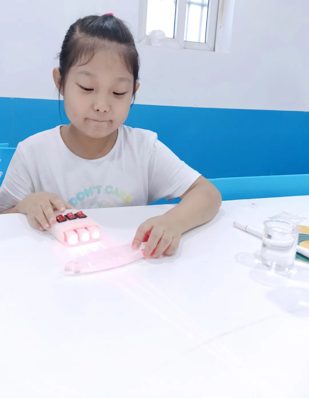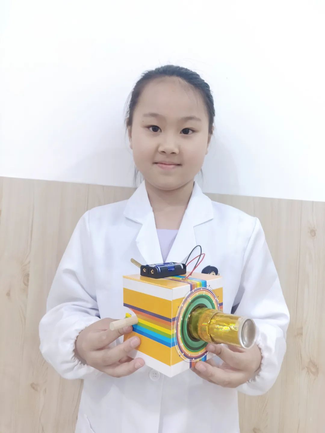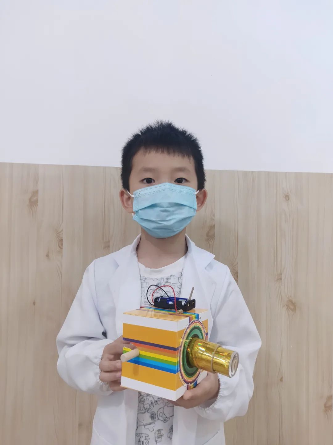 我们制作的“投影仪”是在比较暗的外部环境中,使印有连续图案的图片在内部小灯泡的光照下形成影子,通过转动图片转轴制造出会动的影子效果,再利用凸透镜的作用将影子放大并投射到幕布上。这样我们就边转动转轴边能欣赏到连续的动画效果了。