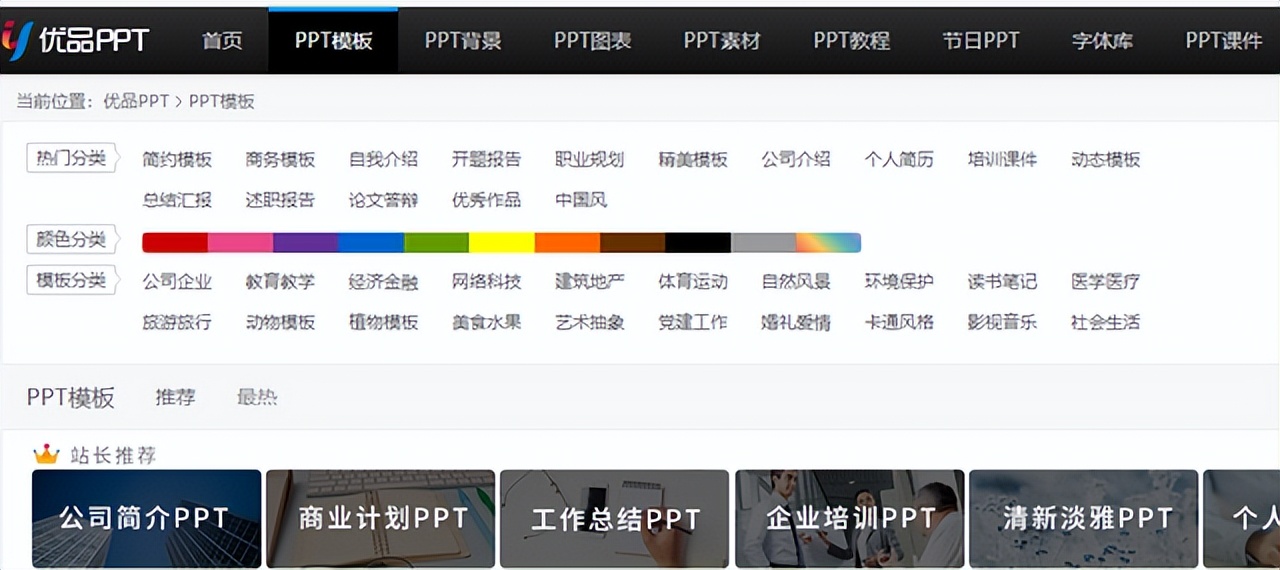 优品PPT收录的PPT简报模板包括简约模板、商务模板、自我介绍、开题报告、职业规划、精美模板、公司介绍、个人简历、培训课程、动态模板、总结汇报等类型,也能依照颜色进行搜寻筛选。