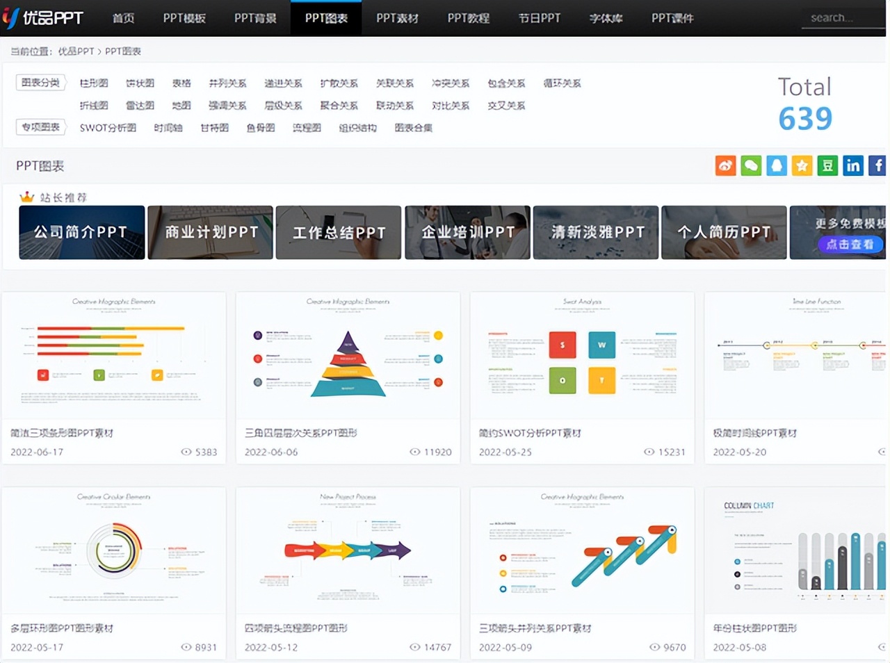 除了模板以外也能找到PPT图表模板,像是柱状图、圆饼图、表格、关系图、SWOT分析图、时间轴、甘特图、鱼骨图、流程图等等,每个图表都有预览图、标题、更新时间和检视次数,点击就能进入详细信息页面并下载档案。