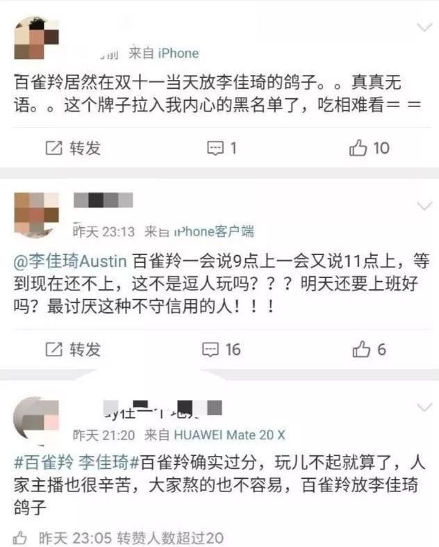 因“网红一哥”李佳琦在直播间的几句话“百雀羚等了两天,我要就要给你们最低价,不然就不要来参加双11,我一直和他们老板扯,刚刚他们说答应我们来,后来就不来,这种没有信任的品牌方,没有必要和他们合作。”“不来就算了,没有关系,百雀羚以后合作就靠缘分好不好。”让百雀羚遭遇了滑铁卢。由于当时正在直播,许多网友亲眼目睹了整个事件,很快,#百雀羚放李佳琦鸽子#瞬间登上热搜,消息传播至整个网络。