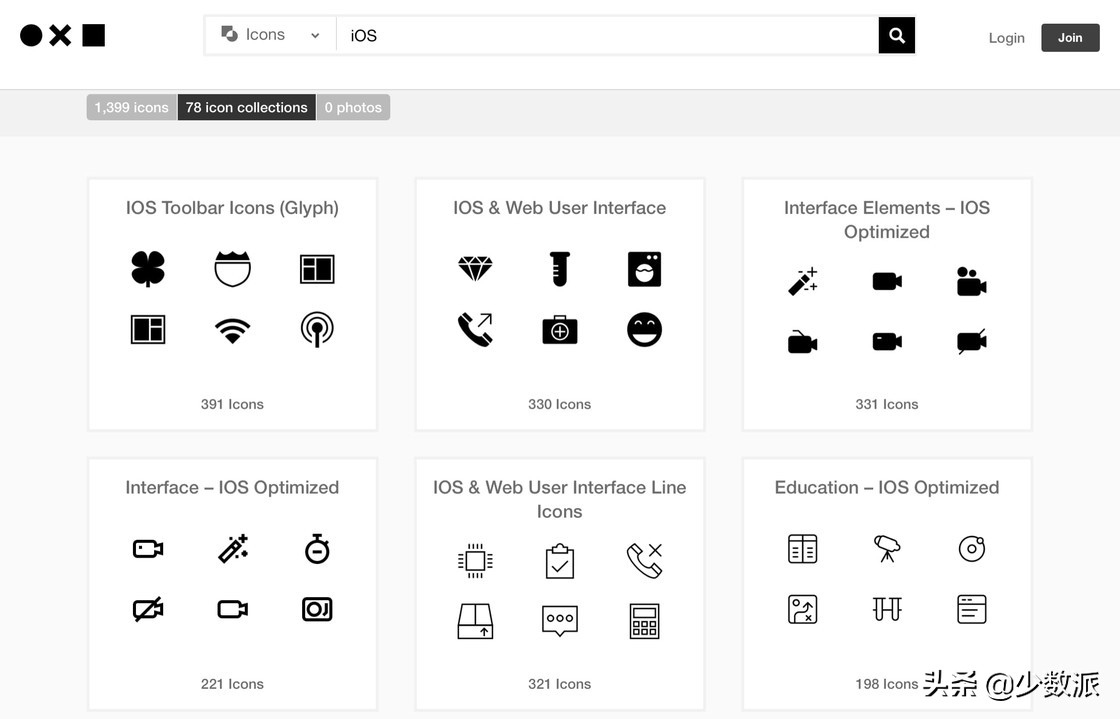 The Noun Project 同样是折腾爱好者的好去处,网站上的图标多以简约线条风格为主,需要自行为其搭配色彩和背景。你可以根据名称来搜索单个图标,当然,如果你想搜索图标包的话,也可以试试搜索「iOS」,随后点击搜索栏下方的「xx(数字) icon collections」来筛选。