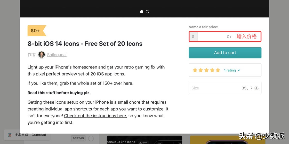 相较于前面提到的 Esty,同样作为在线交易平台的 Gumroad 则更侧重于创意工作者的作品交易。在 Gumroad 中搜索「iOS 14 icons」,也能找到不少好看的图标包。