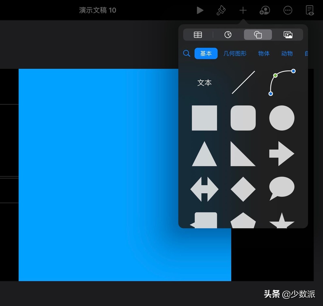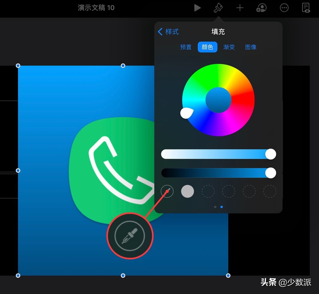 这些步骤同样可以利用 Keynote 来完成。首先,我们同样需要创建矩形、导入图标。随后在编辑矩形样式时,选择「颜色」并向左滑动,点击下方的色彩滴管,随后点击图标的背景色部分。