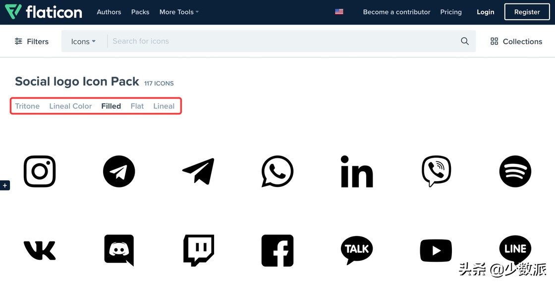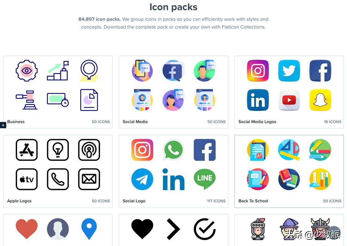 Flaticon 与 Iconscout 有些相似,都以扁平风格的图标包为主。不过 Flaticon 拥有专门的 Icon Pack 分类,你可以点击主页顶部的「Packs」快速筛选出图标包。Flaticon 涵盖了可爱的漫画风、简约的线条风等风格迥异的各种图标。