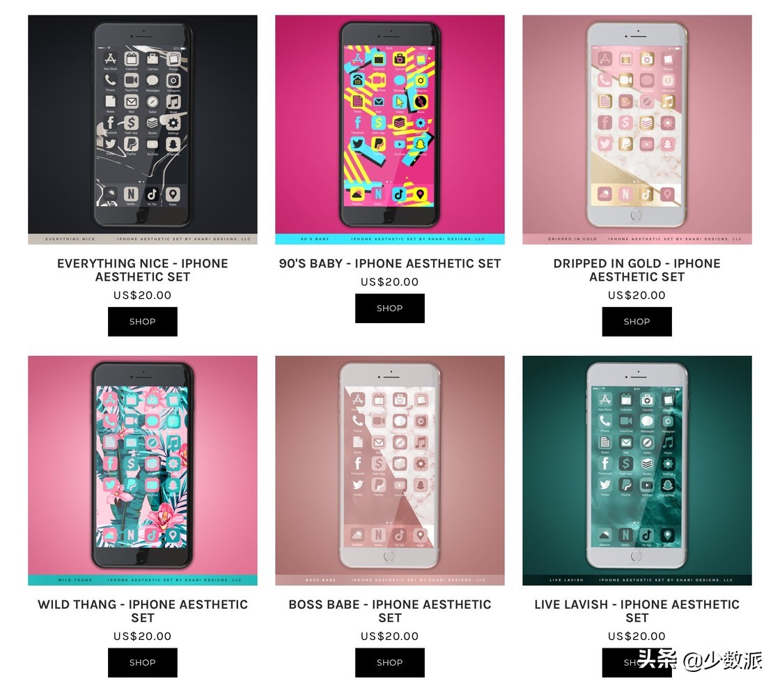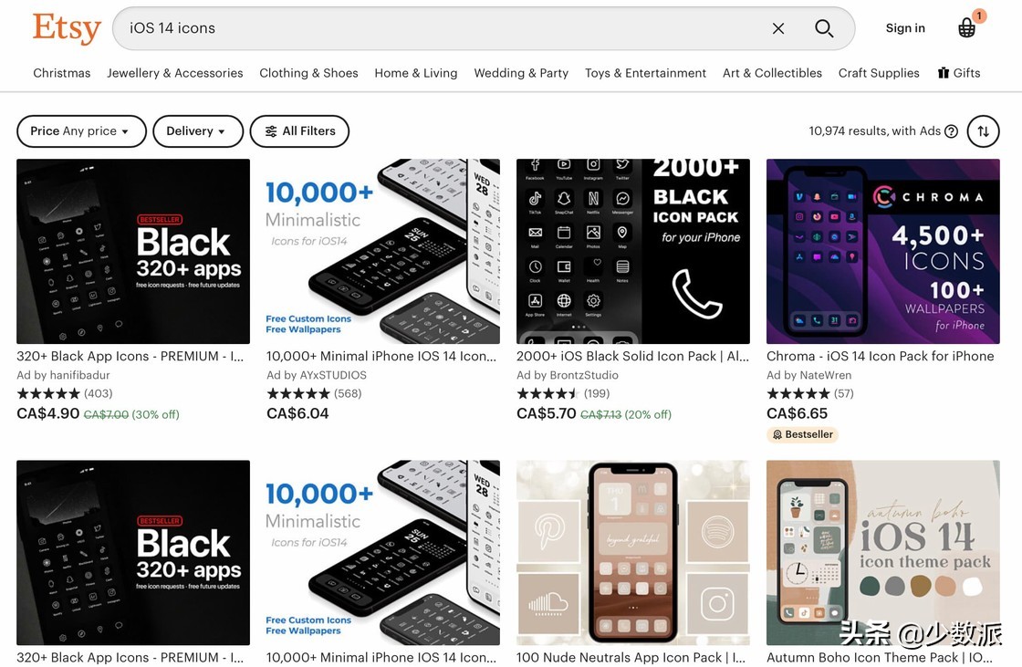 Esty 本是一个在线交易平台,也有不少用户在上面售卖自己制作的图标包。在 Esty 上直接搜索「iOS 14 icons」即可找到许多设计精美的图标包,由于这些图标都是针对 iOS 14 进行设计的,购买后可以直接使用,无需再进行额外调整。