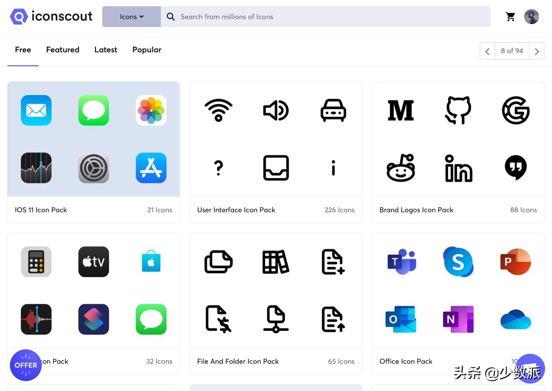 Iconscout 拥有相当丰富的图标资源,无论是系统应用、办公软件还是社交平台的图标都可以在 Iconscout 上找到。Iconscout 上的图标大多是扁平风格的图标,同时也不乏像 iOS 11、Galaxy S8+ 这样成套的系统图标。