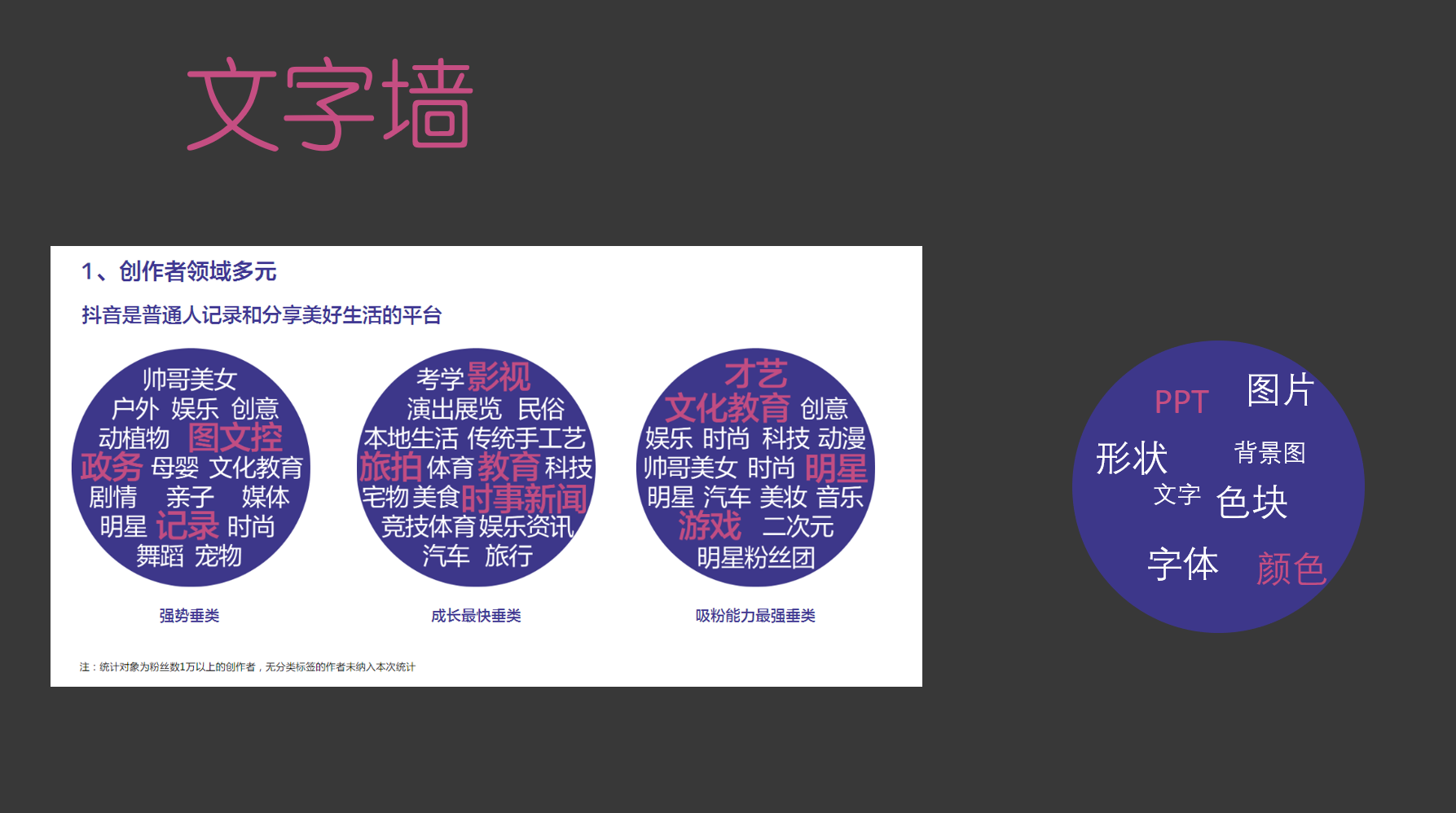 看起来很震撼的效果,制作起来非常简单,把文本框排布在页面上就可以了。对重点的内容进行放大、变颜色处理,增加层次感。