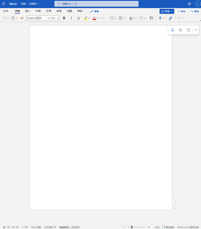 开启大多数用户都会用到的 Word 网页版,界面看起来跟 Word 软件很像,主要编辑区在中间,上方是一整排选项按钮和功能,下方则有字数统计和版面放大缩小。