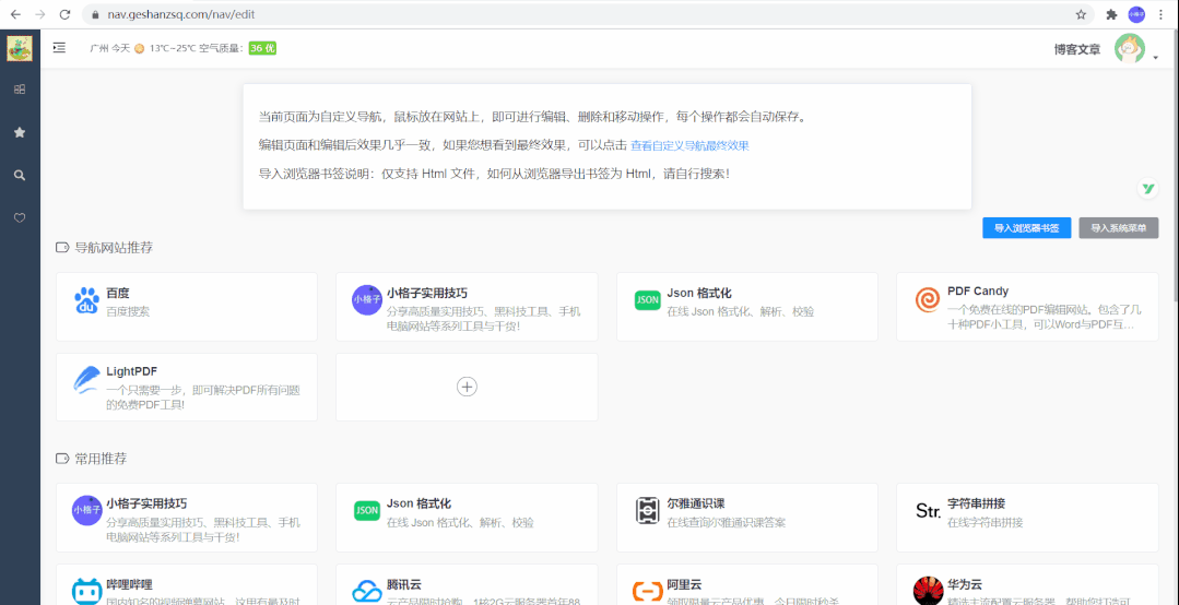 这个功能也挺好的。可以导入浏览器收藏的网站。点击导入浏览器书签,选择从浏览器导出书签的 Html 文件即可。