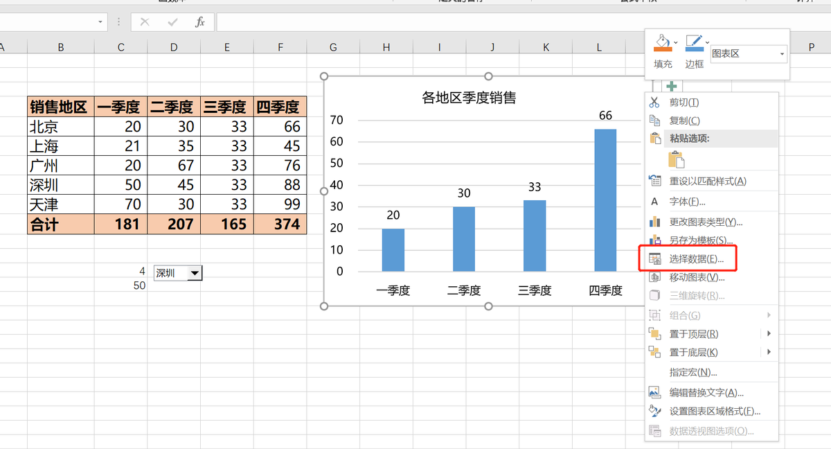 控件设置完成,选择地区选项,C13会弹出每个地区对应的位置,如,选择深圳,C13显示的数据为4。
