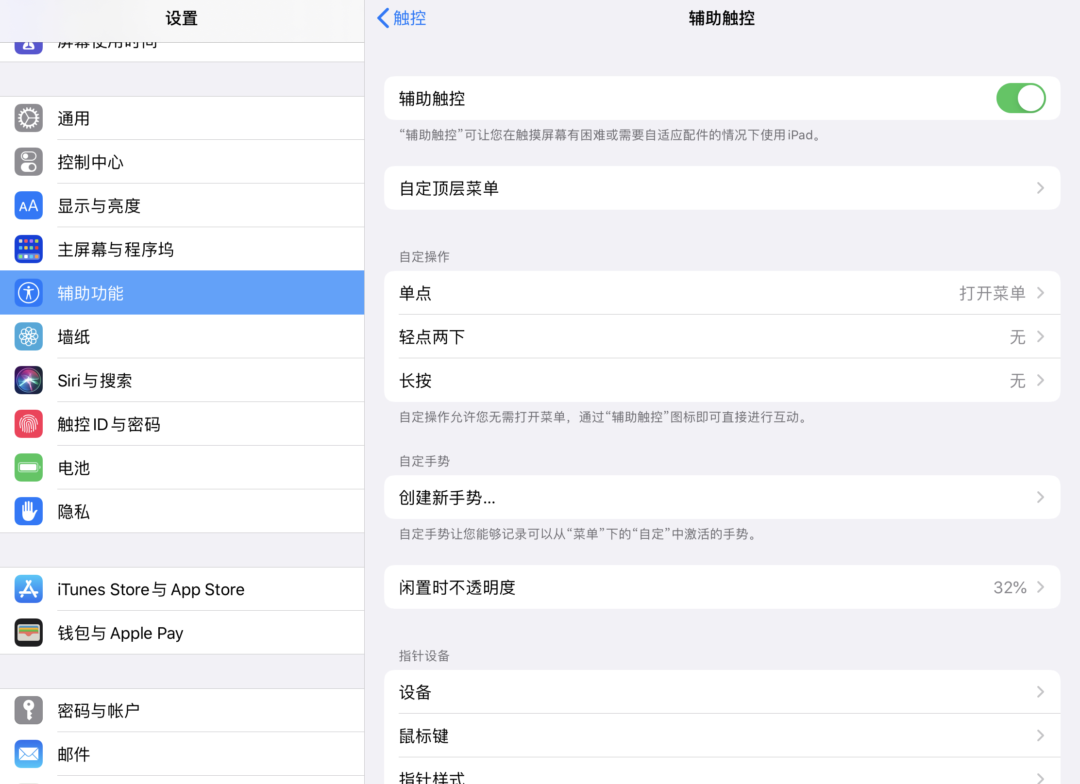 iPad截屏的快捷键是Home键+开机键,用了一段时间过后就会觉得很麻烦。后来别人告诉我一个特别好用的办法,那就是打开iPad的辅助触控,这个辅助触控会形成一个很小的图标悬浮在我的桌面上,在我需要截屏的时候点它就可以了。