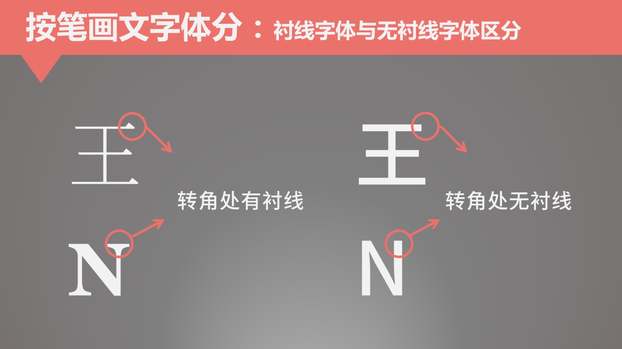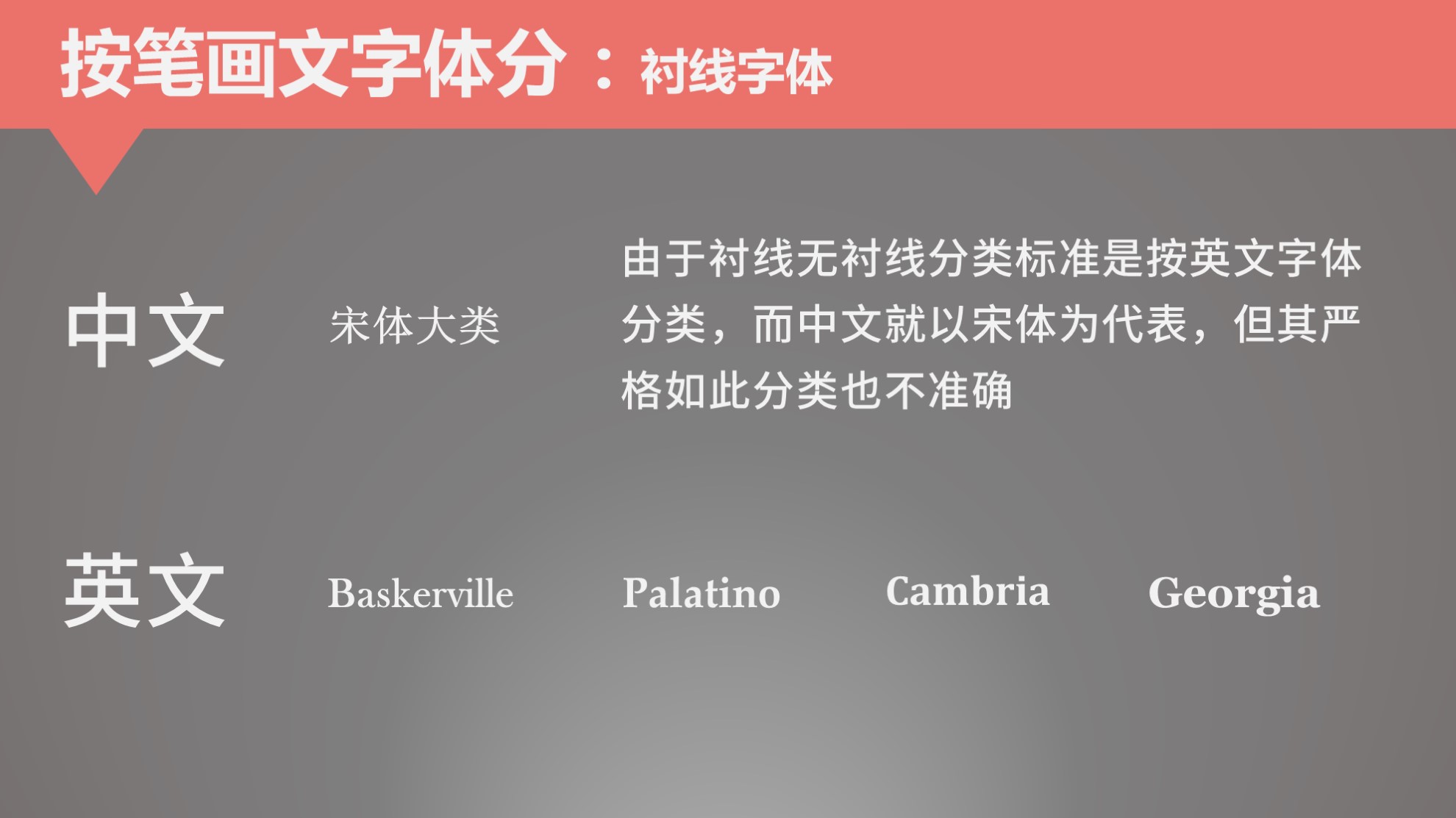 这里主要说衬线与非衬线字体,因为现在普遍字体都是这样划分,其依据西方对字母体系的划分。