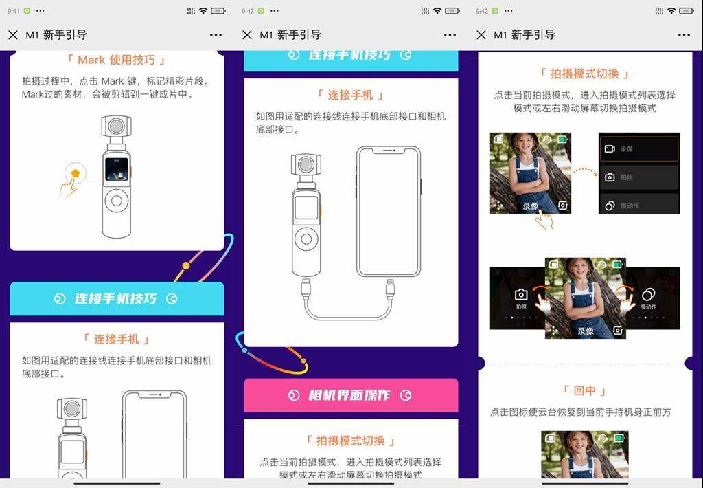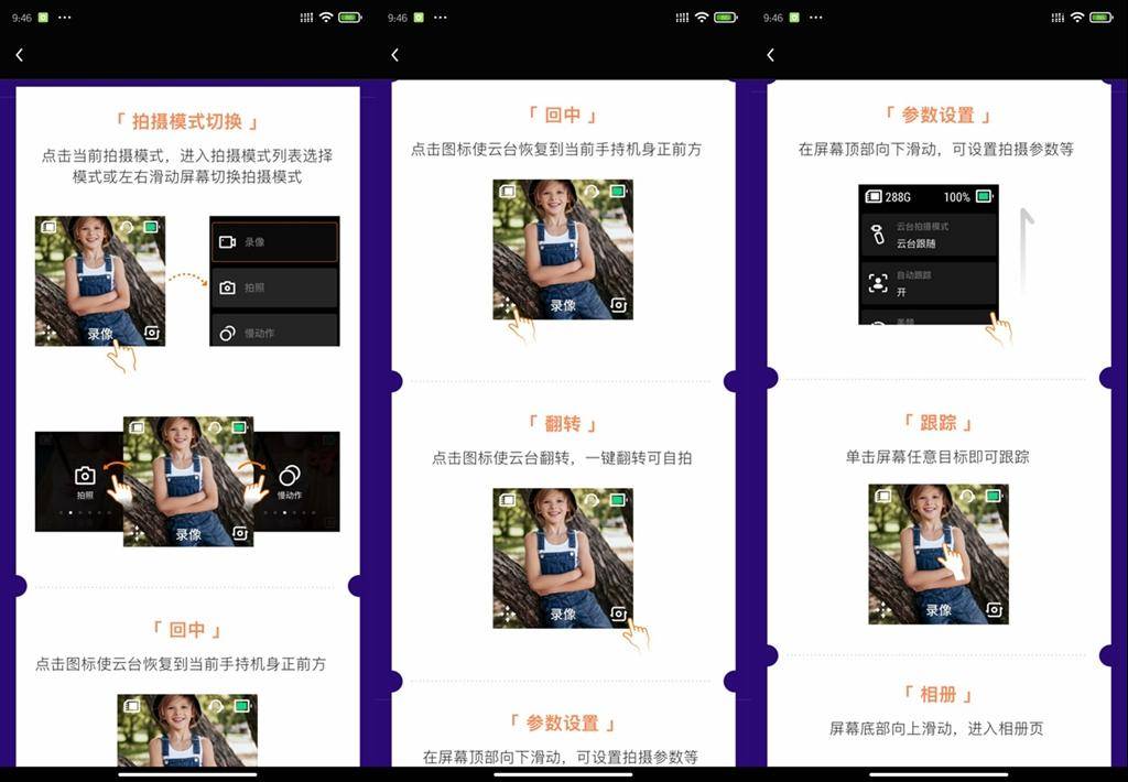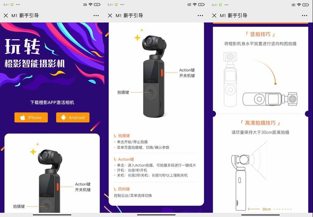 橙影APP对于云台的操作进行了非常详细的介绍,我推荐耐心的看完,除非你不是第一次使用VLOG相机,或者之前就有使用过手机云台的经验,毕竟如Action,高清拍摄技巧,每个机器的设置和使用方法并不一样。