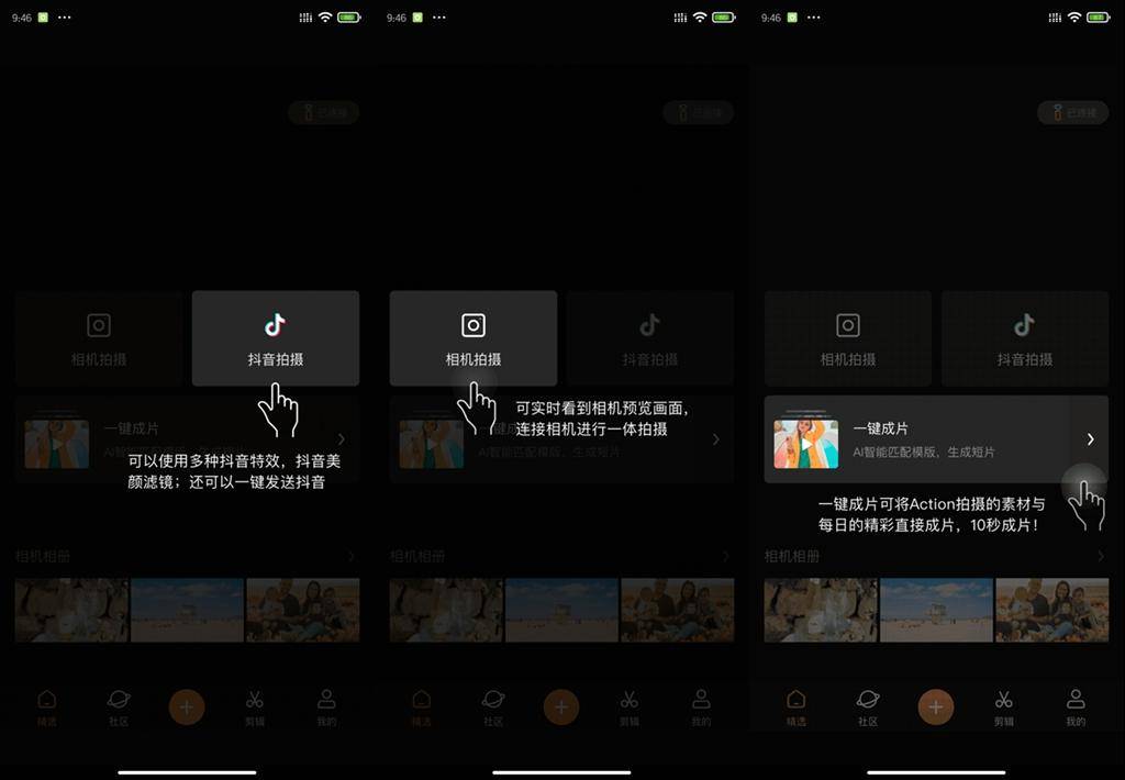 右边的Action按键,是可以直接通过拍摄四部分直接生成视频,类似于一个短视频的快捷拍摄按键,长按开机,短按开始Action拍摄。适合拍摄小片段和一个题材的短视频。