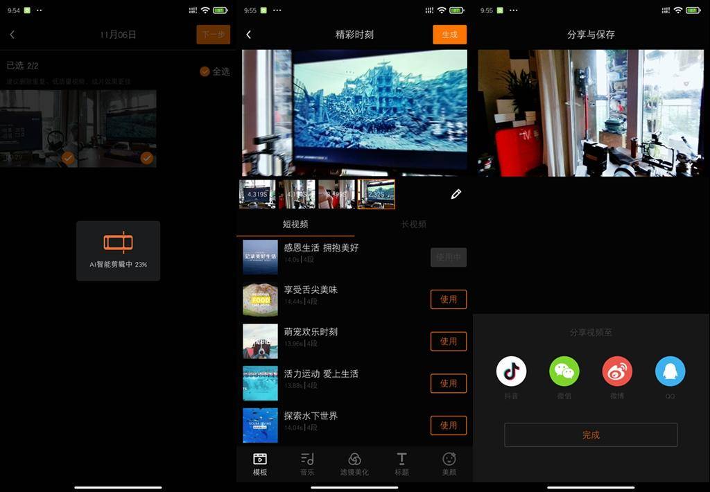 选择一键成片,选择内部拍摄的视频片段,通过增加字幕,片头,还有配乐,就可以生成一个简单的视频, 这个视频是我拍摄的一段自己的桌面的小视频。虽然背景杂乱无章,但是效果不错。视频剪辑可以一键发布抖音,微信,微博,QQ ,等等社交网络。