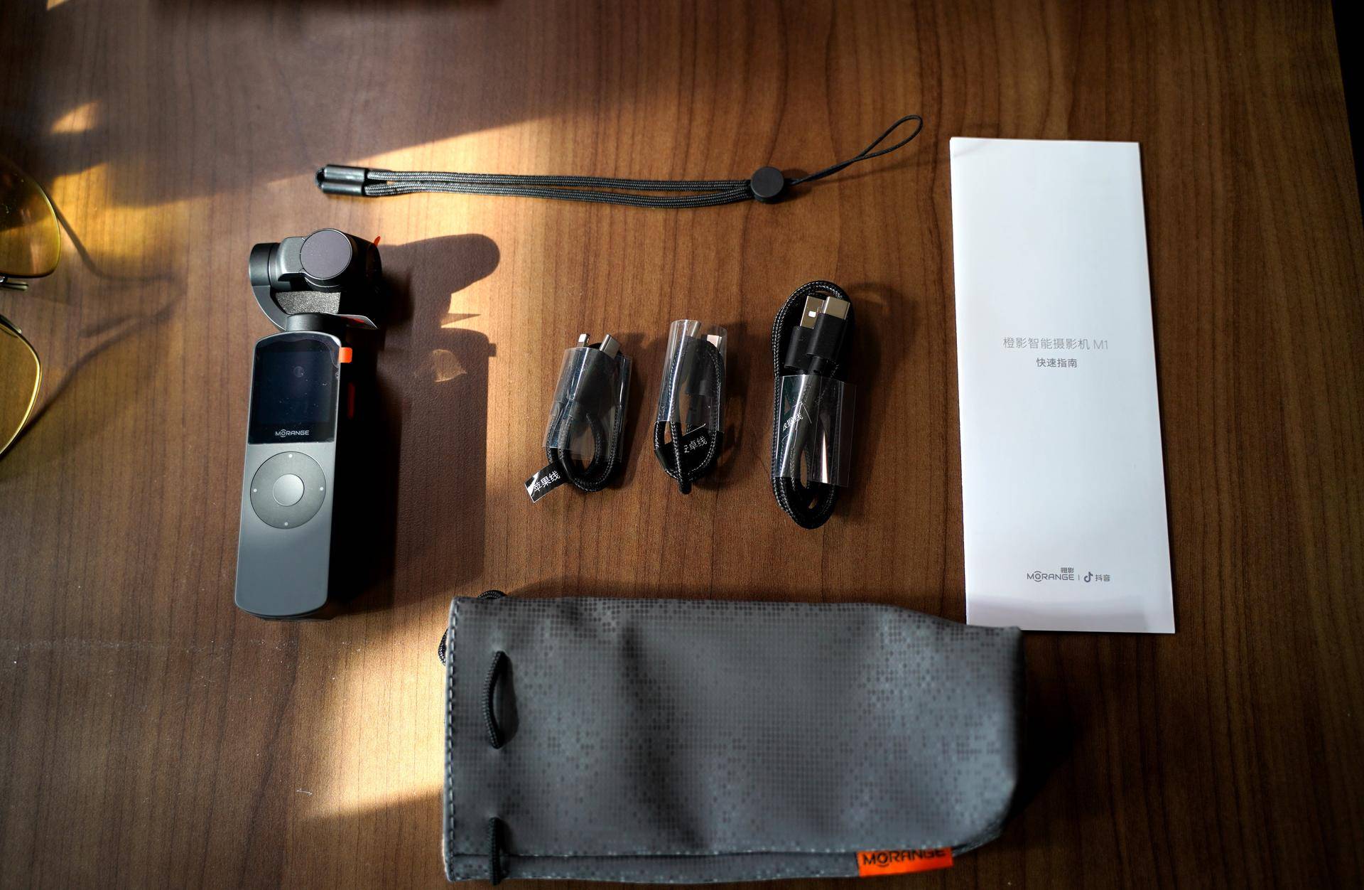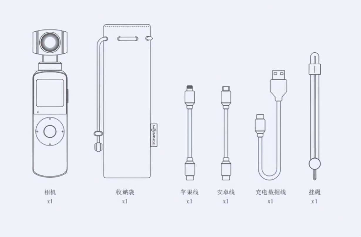 包装内部出了相机本身,还附送一个收纳包,两个数据线(支持C口,支持Lighting口)充电线,腕带。拆除相机的几个反向轴的保护就可以使用相机了。