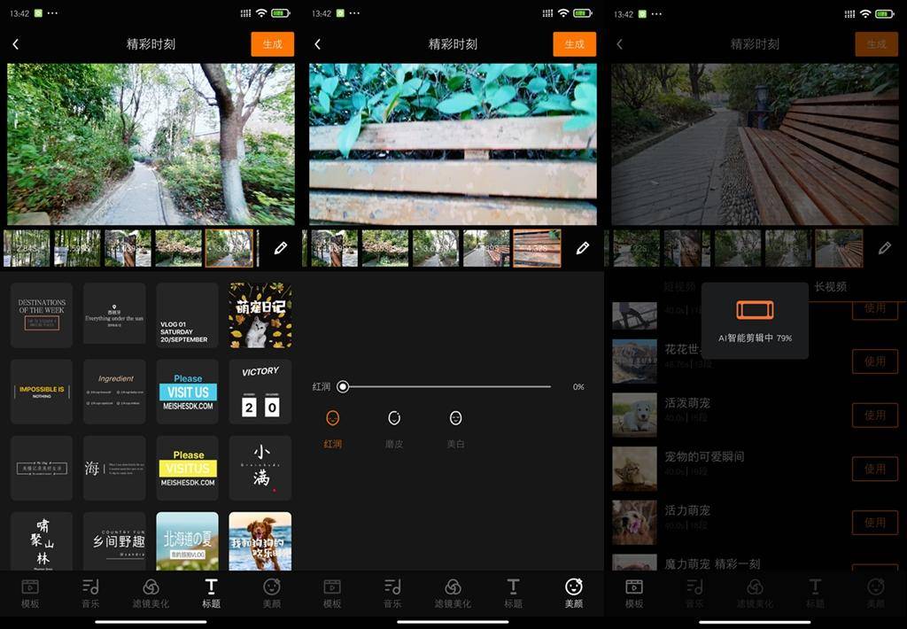 对于长视频的制作,橙影内部也有专门的模板,可以修改不同的风格模式,旅行,美食,好友聚会等等都可以自己修改,如开头的酷炫题目,视频的滤镜风格等等。上面这一段是我们在小区拍摄的10多段短视频的自动剪辑。