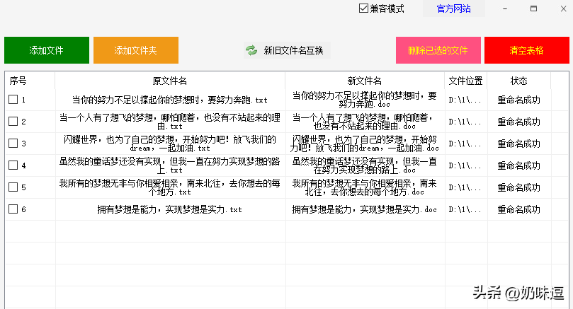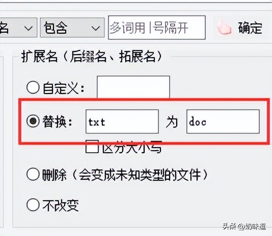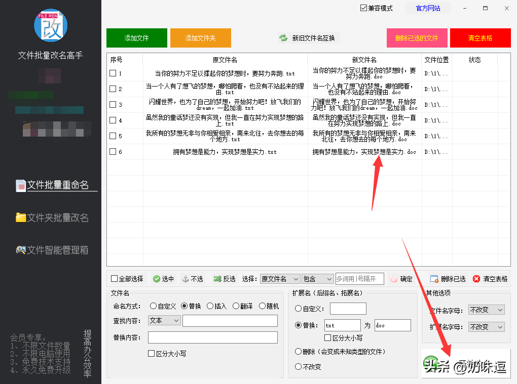2.所需工具安装一个文件批量改名高手文件素材若干操作步骤步骤1:运行【文件批量改名高手】,先导入文件素材,小编测试导入的是多个TXT文本文档步骤2:导入后,将命名方式切换为“替换”,不输入任何内容,其他没有需要可以不设定步骤3:直接在“拓展名”中,将选项设定为,比如说“替换:txt为doc”步骤4:确定选择好一系列相关的选项之后,单击右下角的“开始改名”这个按钮步骤5:很快我们就可以在表格中的“状态”一列中,看到“重命名成功”这个提示啦步骤6:最后打开文件夹查看,所有文件的拓展名,即后缀名都成功修改了,均为DOC文档,非常方便