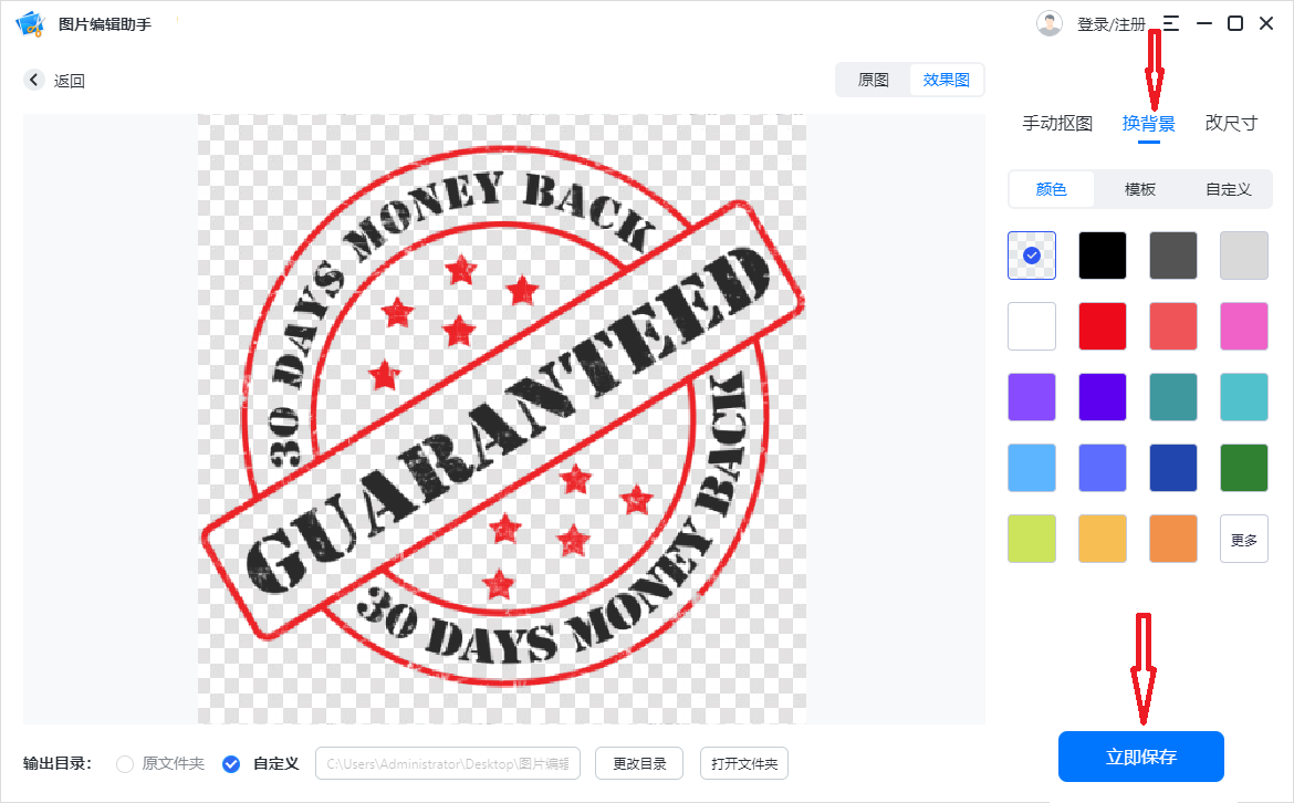 接着我们可以看到印章的背景已经被抠除了,并且印章的形状也是完整的,这个时候我们可以点击【换背景】直接将印章使用到需要盖章的文件图片上。如果需要保存留作使用我们可以直接点击保存为“.Png”格式,这样图片的背景才是透明的哦。