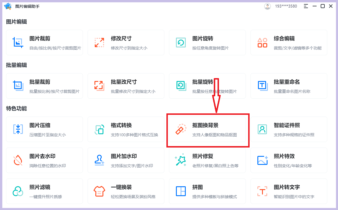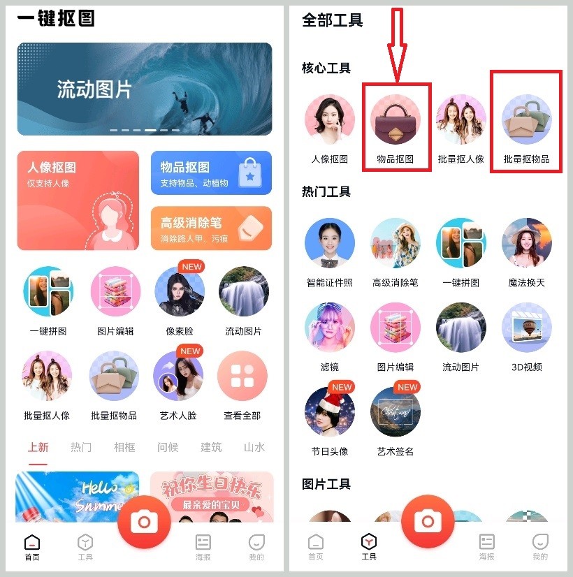 使用这款工具我们同样可以将印章完整地抠出来,打开之后我们点击【抠图换背景】然后选择【物品抠图】,将印章照片导入。