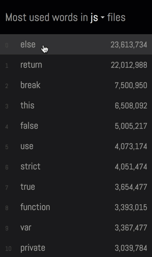 此词汇出现的行应不超过120个字符。这能帮助我们过滤掉那些并非人为编写的代码,例如经过精简的JavaScript代码。