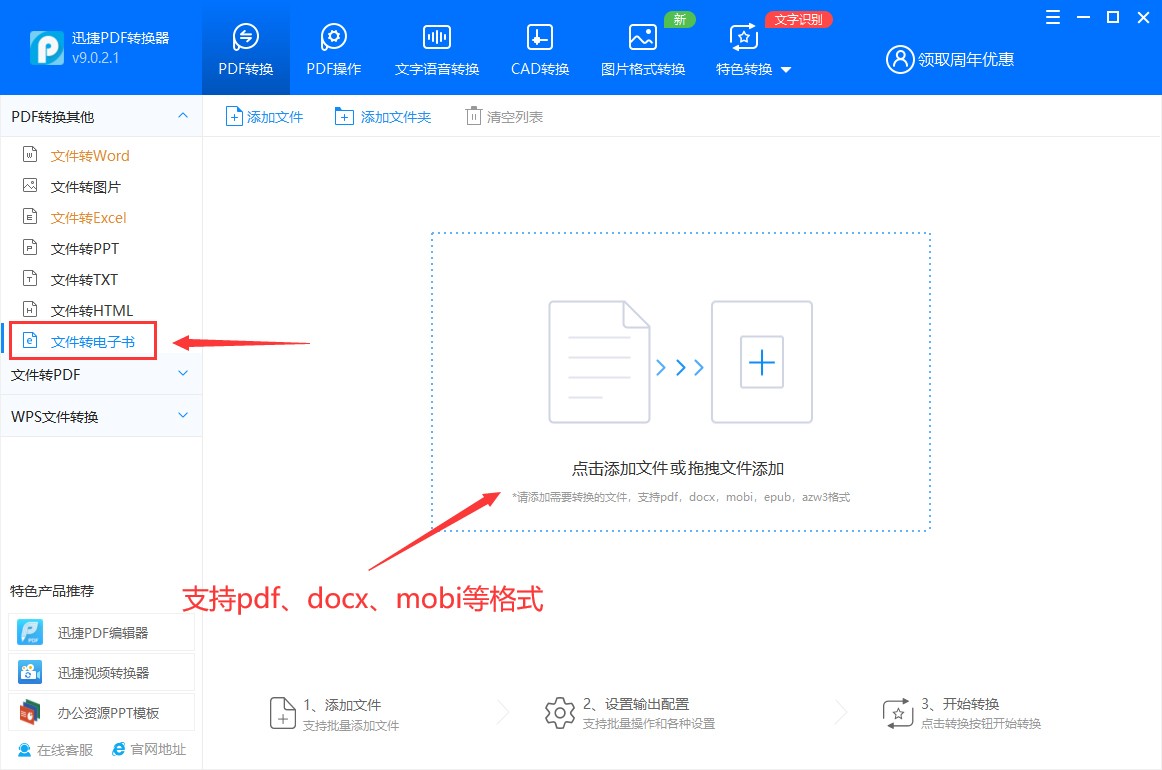 打开迅捷PDF转换器操作界面,点击左侧选择PDF转换其他的功能,选择“文件转电子书”,文件类型包括pdf、docx、mobi格式;