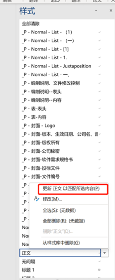 修改完后,选中修改后的这一段话,在样式表中,右键点击【正文】 ,选择【更新正文以匹配所选内容】,即可全部更新。