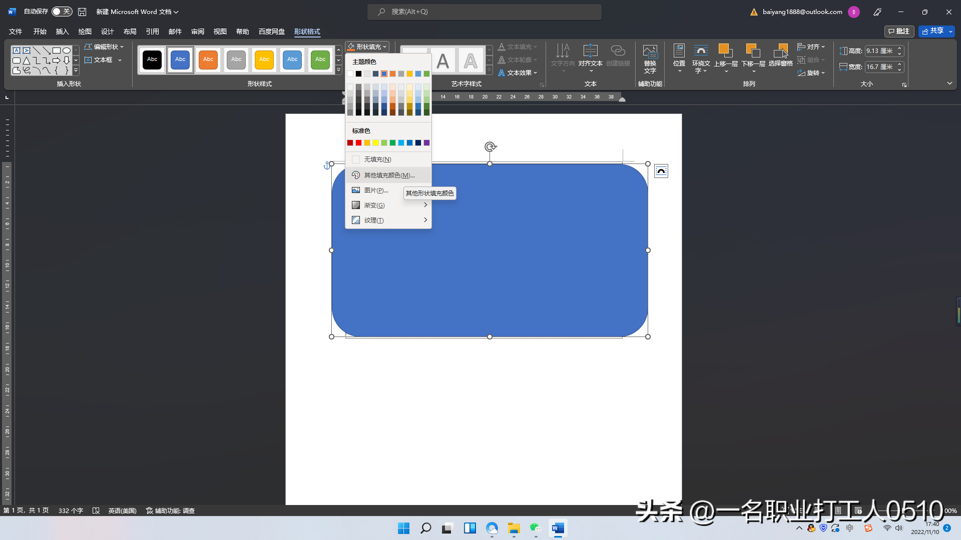 切换到插入选项卡,在插图组中单击形状按钮,在弹出的下拉列表框选择矩形圆角选项--------------将光标移动到文档中,按住鼠标左键不放,拖动鼠标绘制矩形,将矩形覆盖整个页面,释放鼠标左键---------------选中该矩形,在绘图工具栏中,切换到格式选项卡,在形状样式组中单击形状填充按钮,在弹出的下拉列表中选择其他填充颜色选项---------------弹出颜色对话框,切换到标准选项卡,然后选择一种合适的颜色------------选中该矩形,然后单击鼠标右键,在弹出的快捷菜单中选择其他布局选项菜单项------弹出布局对话框,切换到文字环绕选项卡。在环绕方式组合框中选择衬于文字下方选项。然后单击确定按钮即可