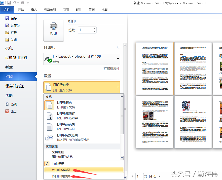 打印奇数页和偶数页适合于在纸张的两面打印,我们可以先打印奇数页,然后打印偶数页。